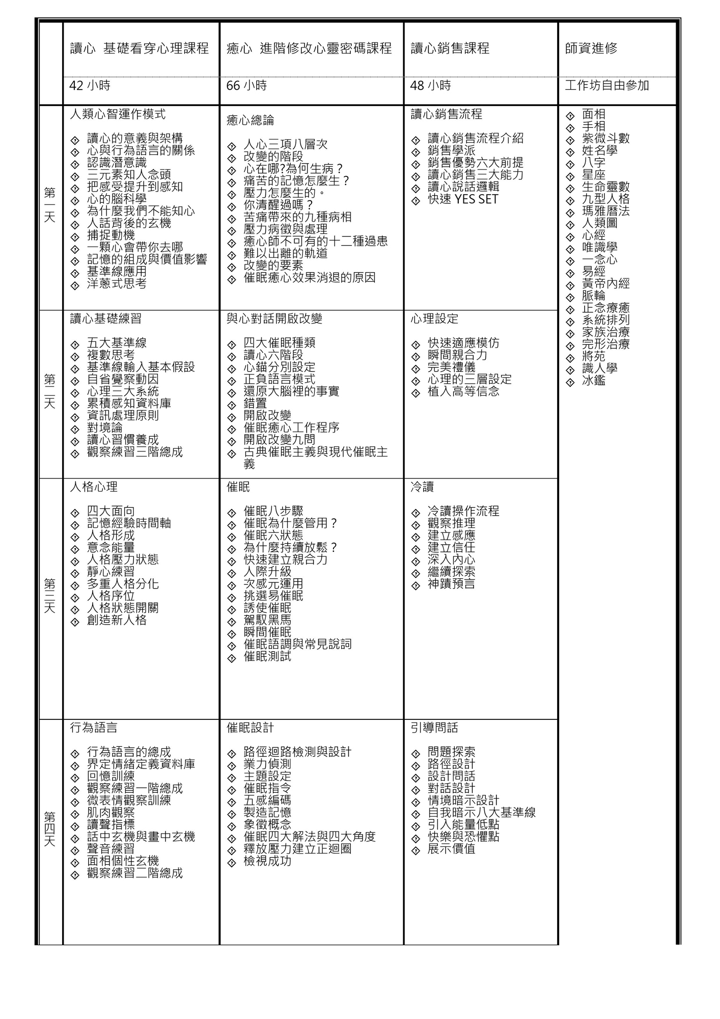 讀 心 術 癒 心 術 系 統 課 程 完 整 列 表