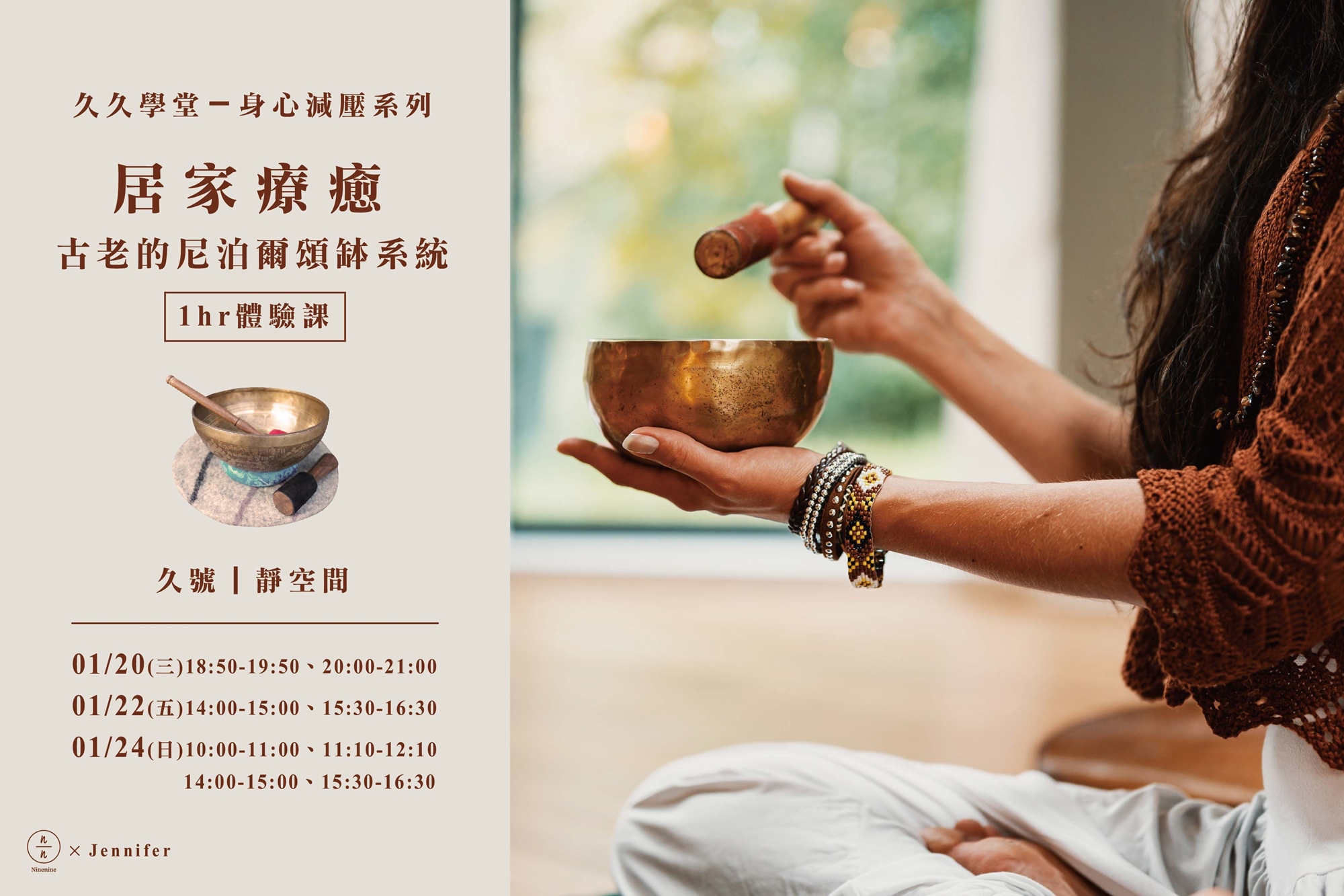 初階課程中含蓋了理論與實做,Jennifer老師會著重於和大家互動教學,讓您認識古老的尼泊爾傳統頌缽使用方式,並教大家如何使用頌缽做居家的日常療癒。