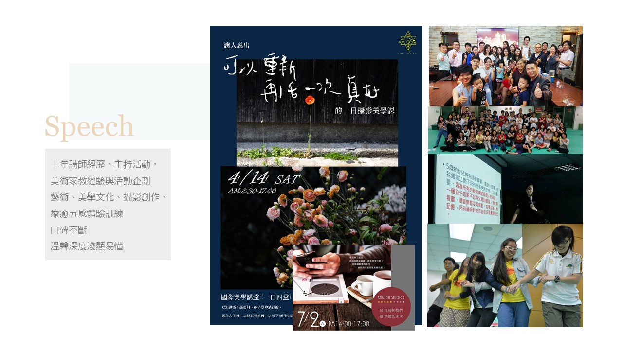 詩曼老師有十多年的講師經驗,講課風氣活潑有趣,與時事結合,從大學各社團經驗起家,到各企業單位演講,百場講課經驗,擅長運用各種精彩故事、激發學習動力,堂堂感動且活力十足,深信老師不是給予標準答案而是在啟發熱情,讓學生下課後都願意自我學習為目標。