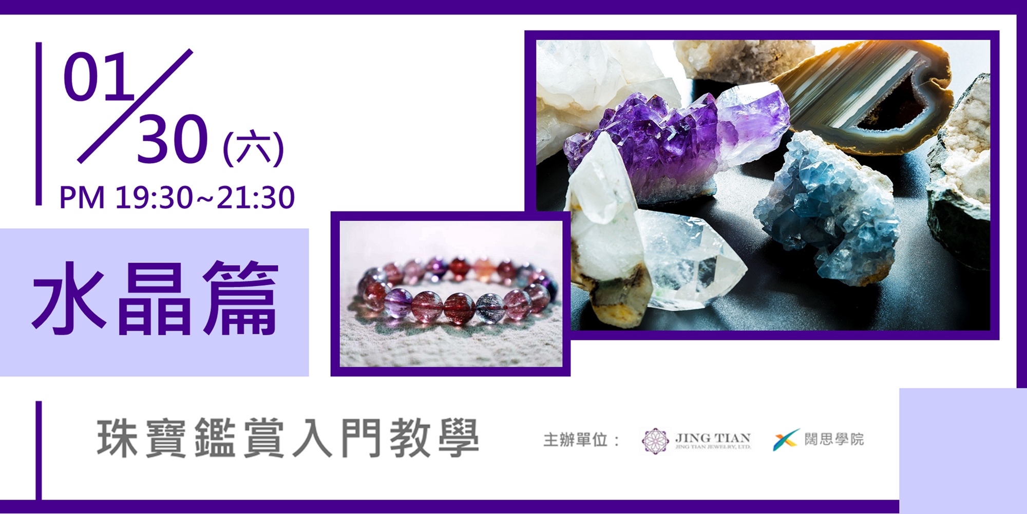 不同種類的水晶及能量寶石,具備了不同的魅力。本次課程特別邀請《京天珠寶》的品牌營運總監 Lucas來帶大家認識水晶、石英家族的欣賞及鑑別,以及詳細介紹其特性、功能、優化處理、仿製品及如何選購等。現場也會帶來實際水晶做示範教學,帶領學員進入水晶及半寶石有趣和充滿能量的領域。