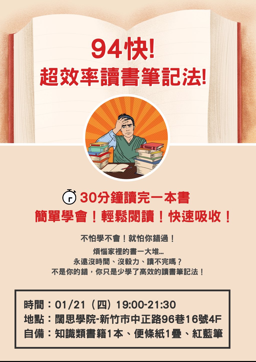 本次講座將教大家如何用 30分鐘讀完一本書!省下無效閱讀的時間!事半功倍,閱讀更快!吸收更好!效率升級!知識升級!能力升級!