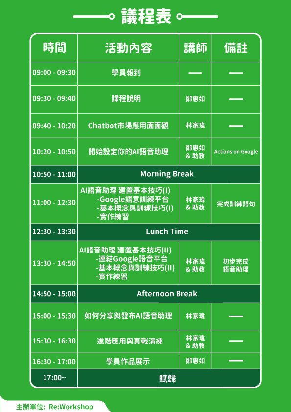 本課程主要是要讓無程式經驗的學員也能實作出 AI 語音助理作品,