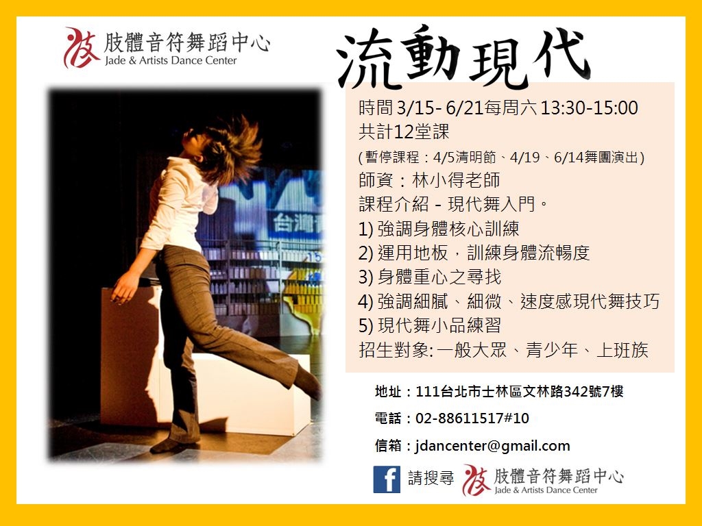 課程時間: 每週六 :流動現代課程 3/15(六)~6/21(六) 13:30-15:00( 共12堂課程。暫停課程:4/5清明節、4/19、6/14舞團演出 ) 【可單堂報名或報名一期12堂有特別優惠喔!!】
