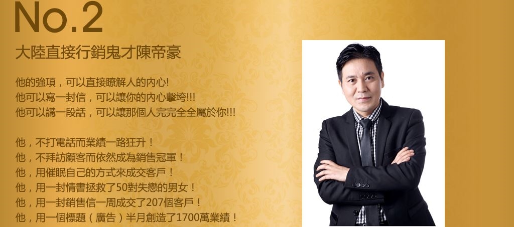 被業界譽為“直接營銷鬼才”,從事營銷10多年,不管在那個行業他都能用一些簡單、直接、有效、不可思議的方式,輕鬆地達到銷售冠軍的業績。