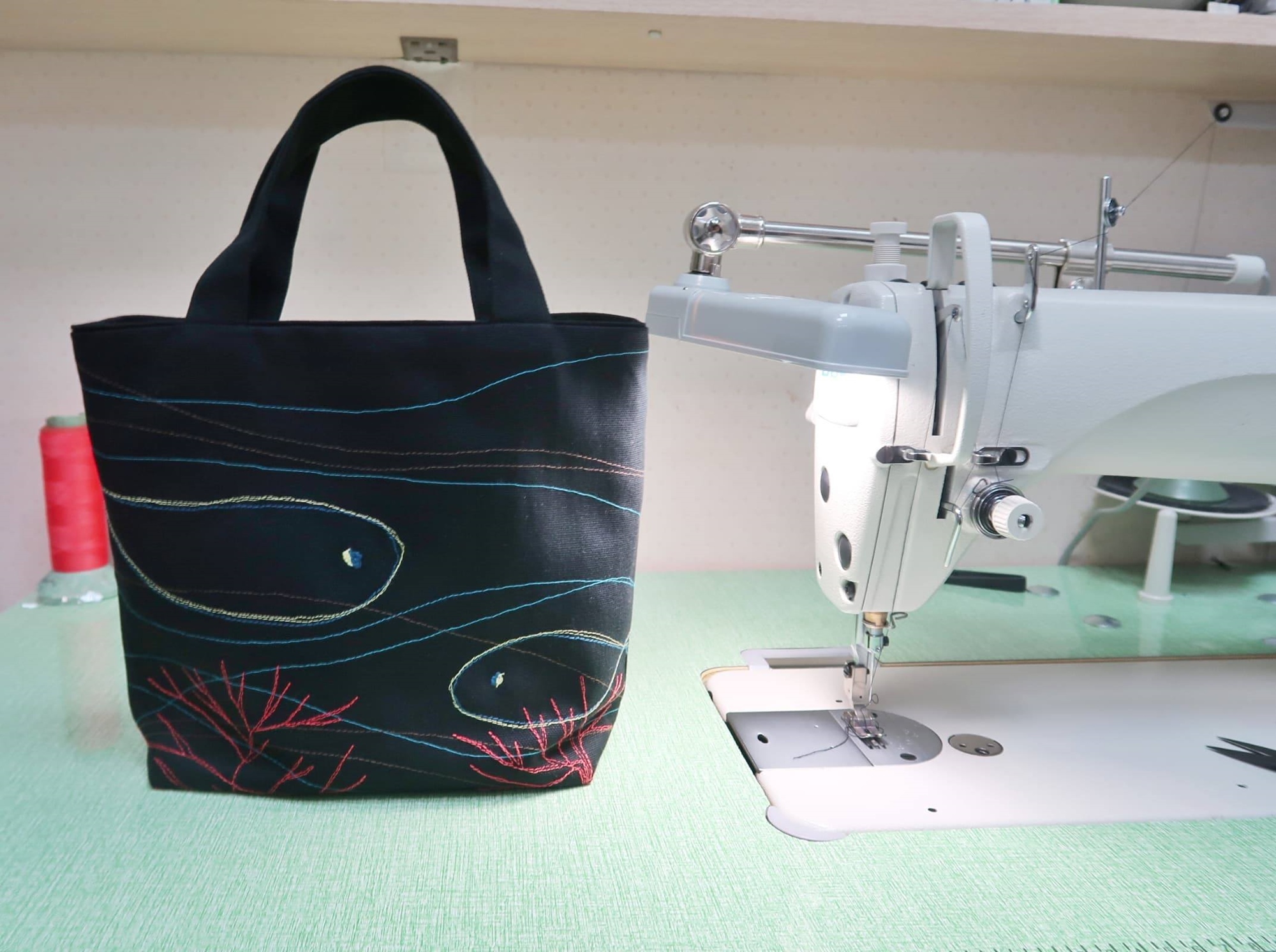 我們要做一些有趣的創作,從200多色車線中挑選喜歡的五個顏色,在黑色布料上創作,課程設計讓你充分練習踩踏工業車與換線之類的基本操作,最後完成一款手提小包