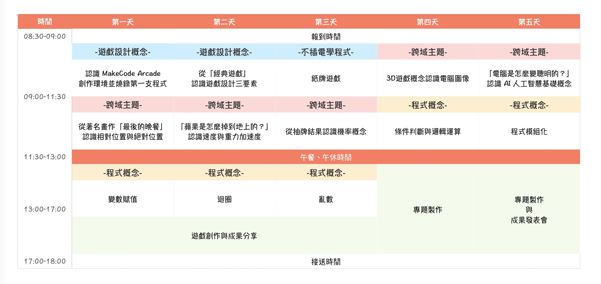 - 豐富作品:課程前三天都各有一個小型成果,最後在五天的累積學習下,將會完成一個大型專題