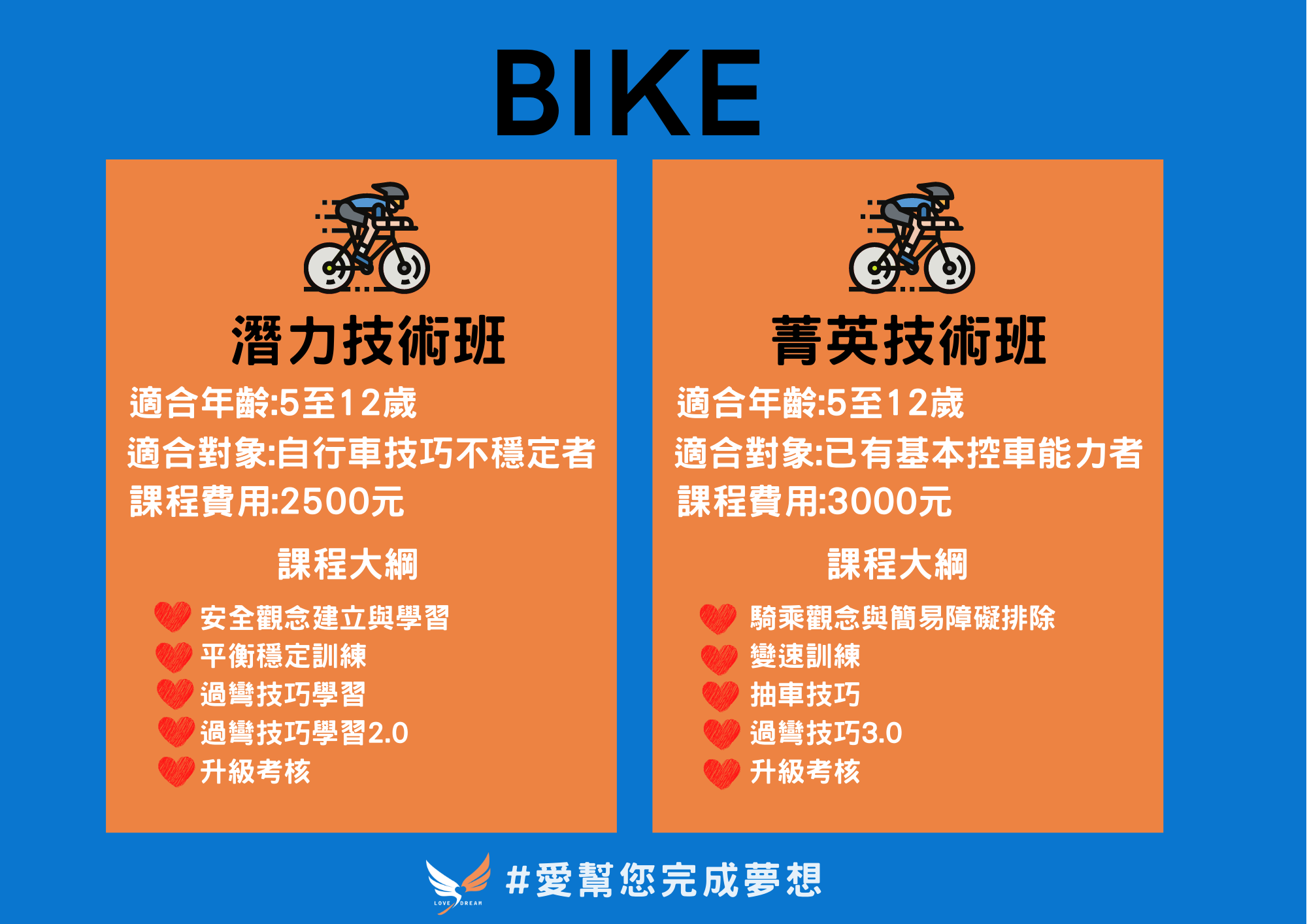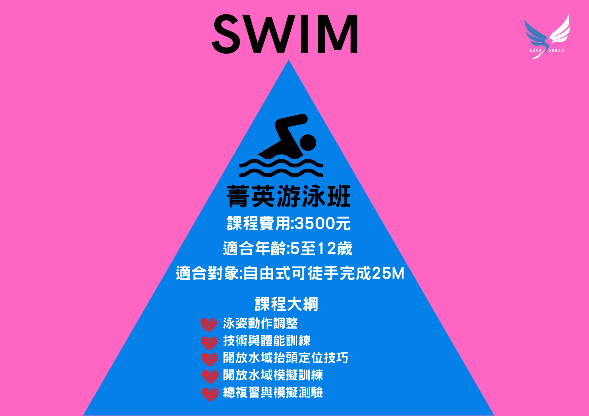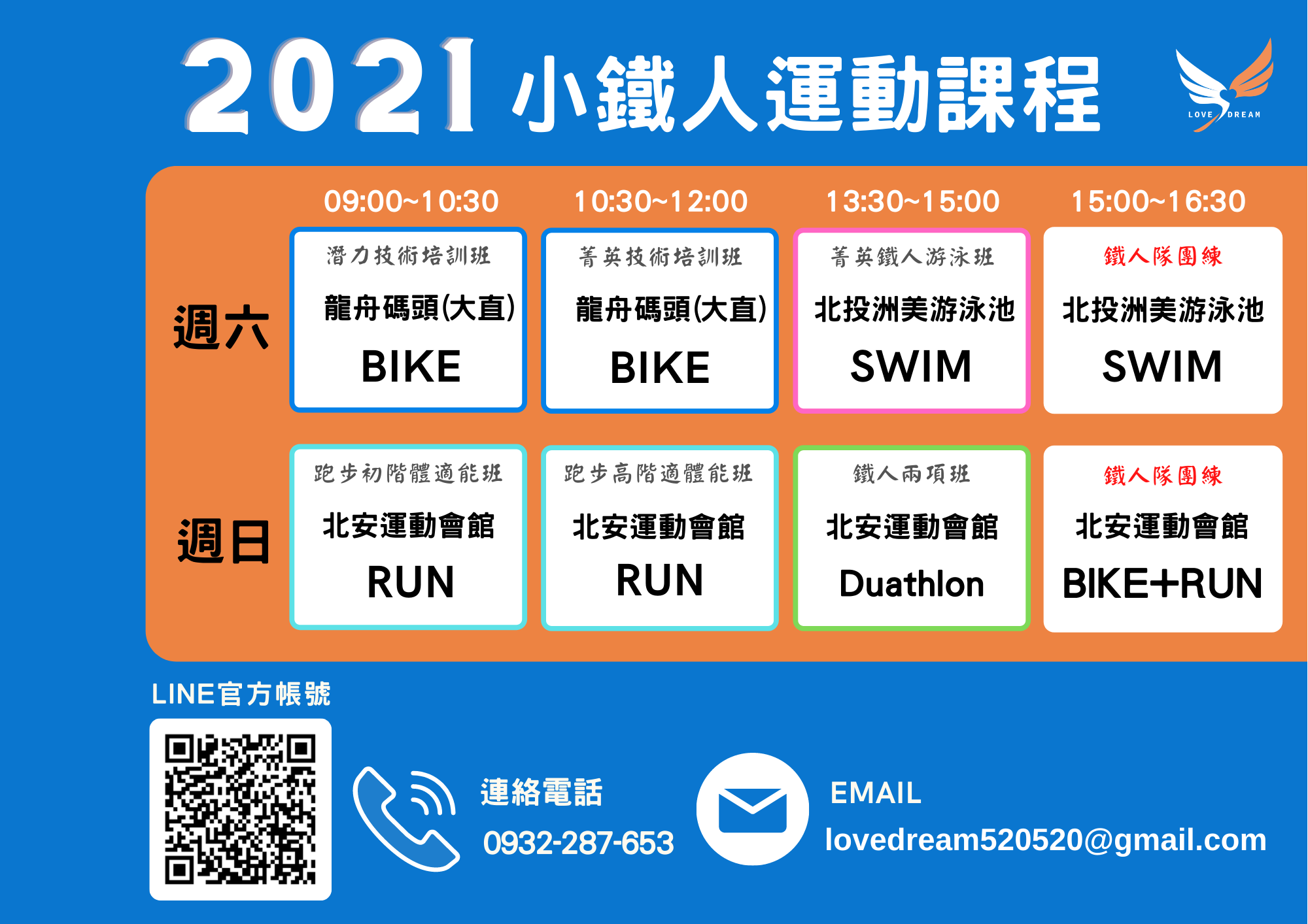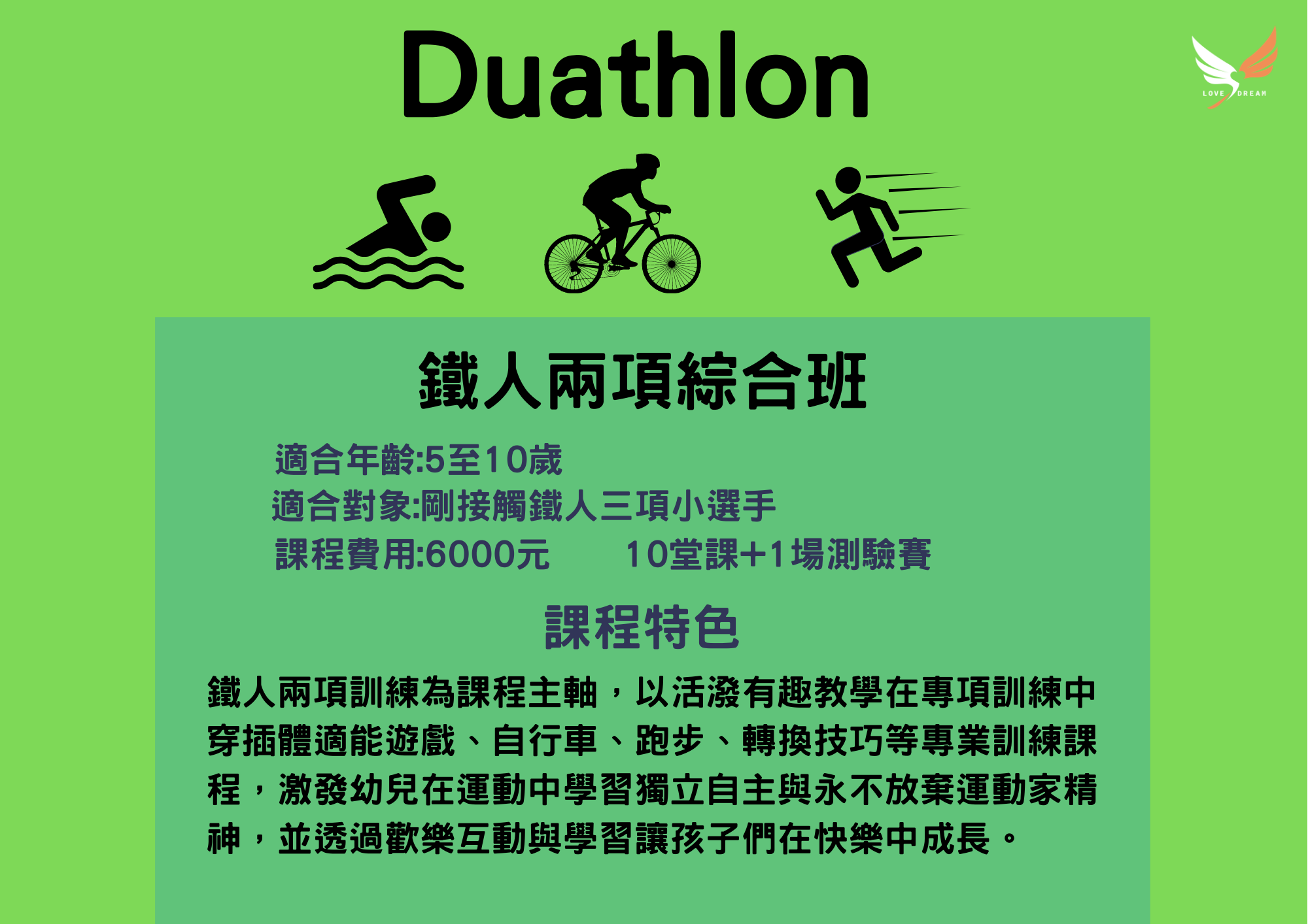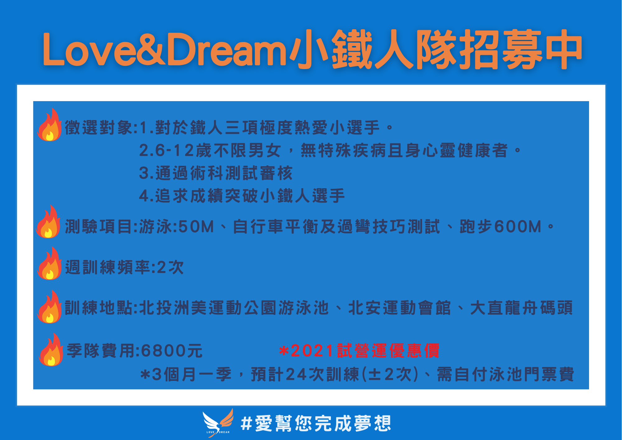 鐵人三項運動是世界上最困難運動之一,需在指定時間內依序完成游泳+自行車+跑步,沒有相當大毅力與決心是無法完成鐵人三項競賽,而Love&Dream運動教學團隊在小鐵人三項教學有相當多經驗,我們願意給孩子機會,鼓勵代替責罵,想法代表競爭力,教學中教練們相當有耐心給予孩子們自由發揮機會,獨立思考空間,會在每期課程尾聲用多元方式讓學員玩成一場特別鐵人賽。希望能從此項運動訓練與比賽中學習獨立、解決問題、堅持及對自己負責態度。