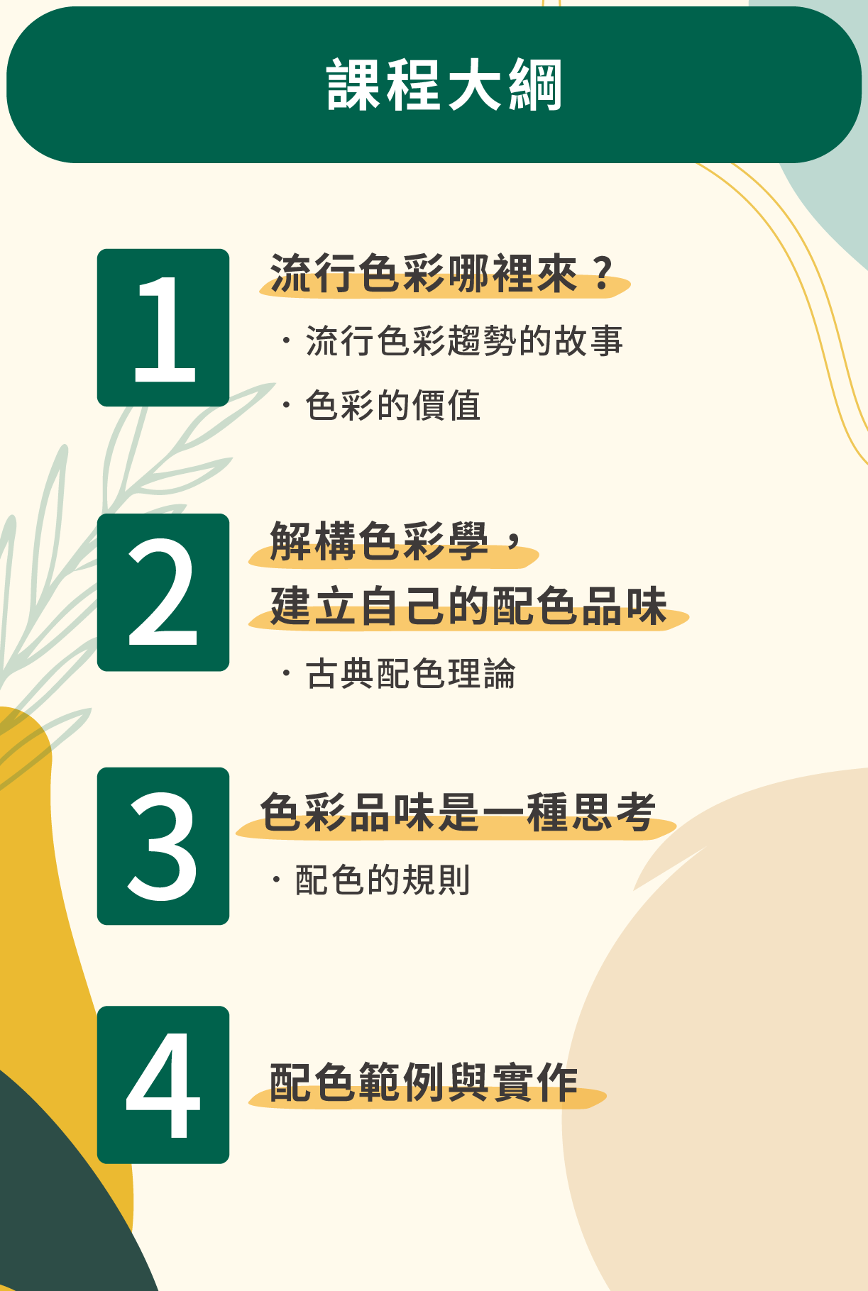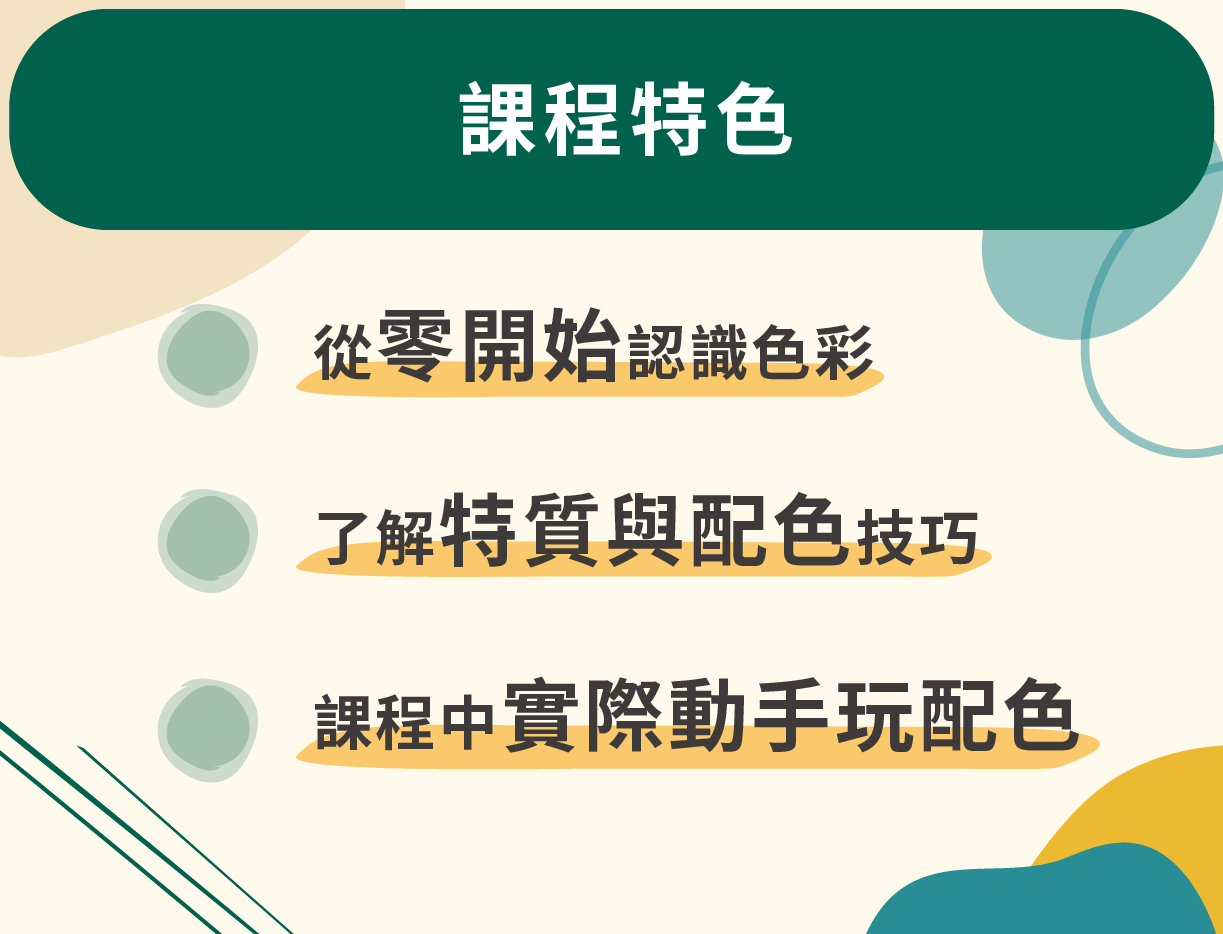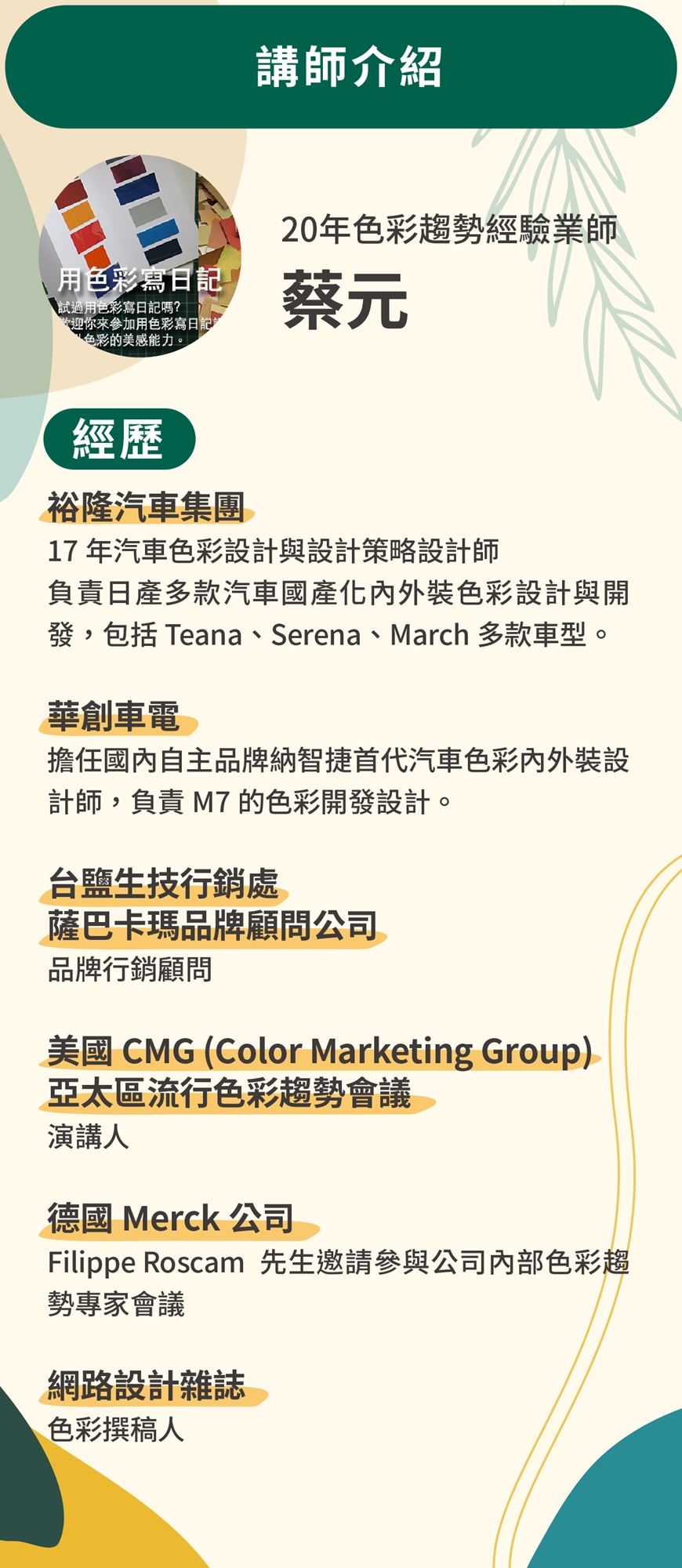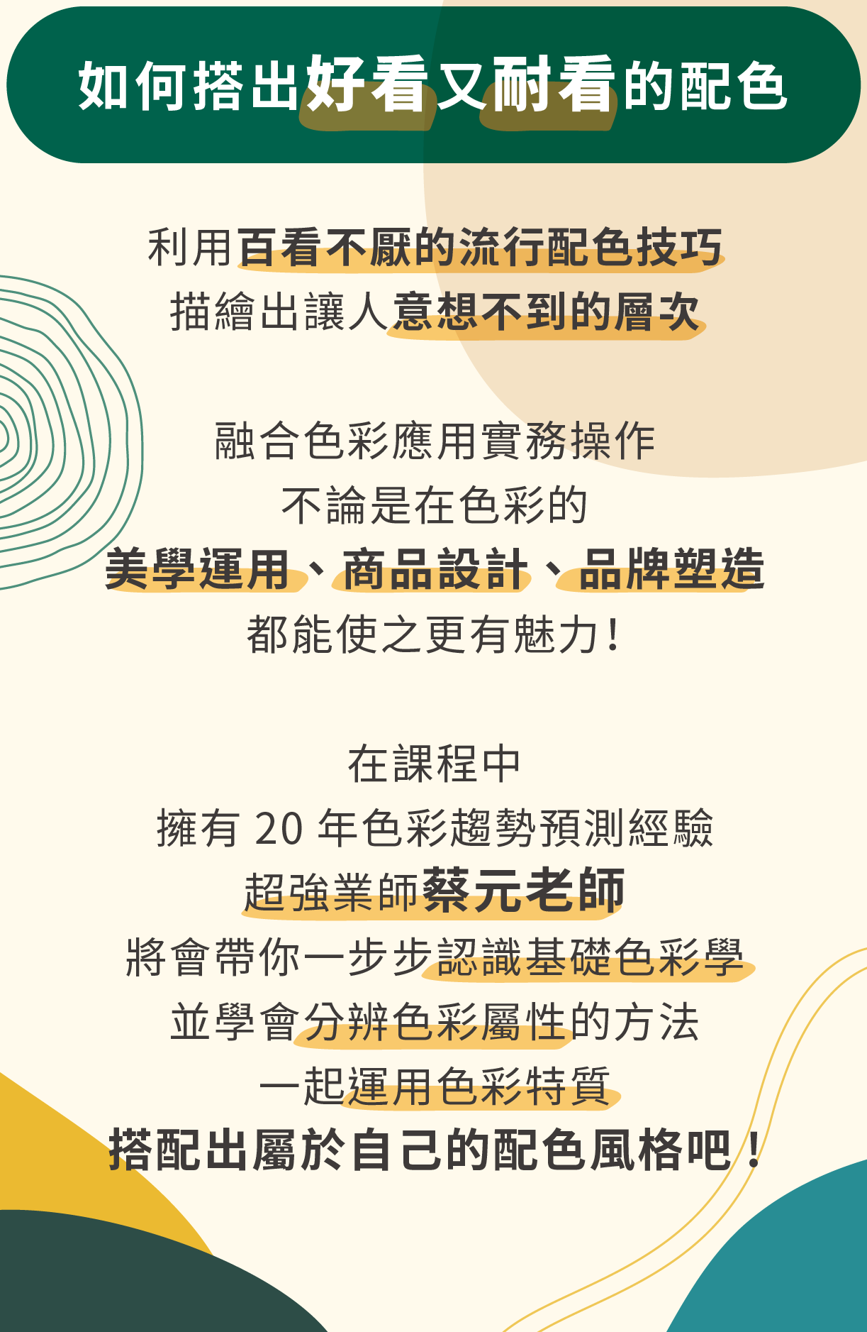 擁有20年色彩趨勢預測經驗的超強業師蔡元老師,將會帶你一步步認識基礎色彩學,並學會分辨色彩屬性的方法,一起運用色彩特質搭配出屬於自己的配色風格吧!