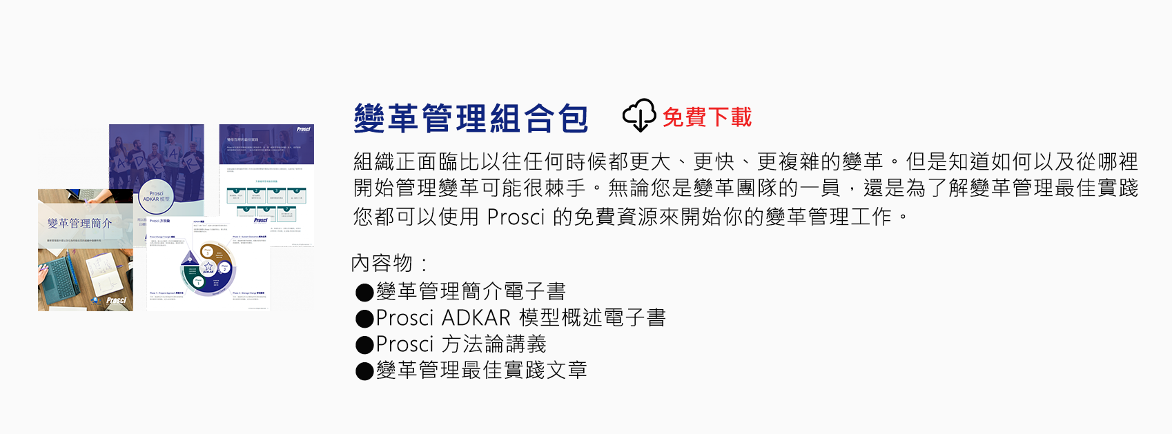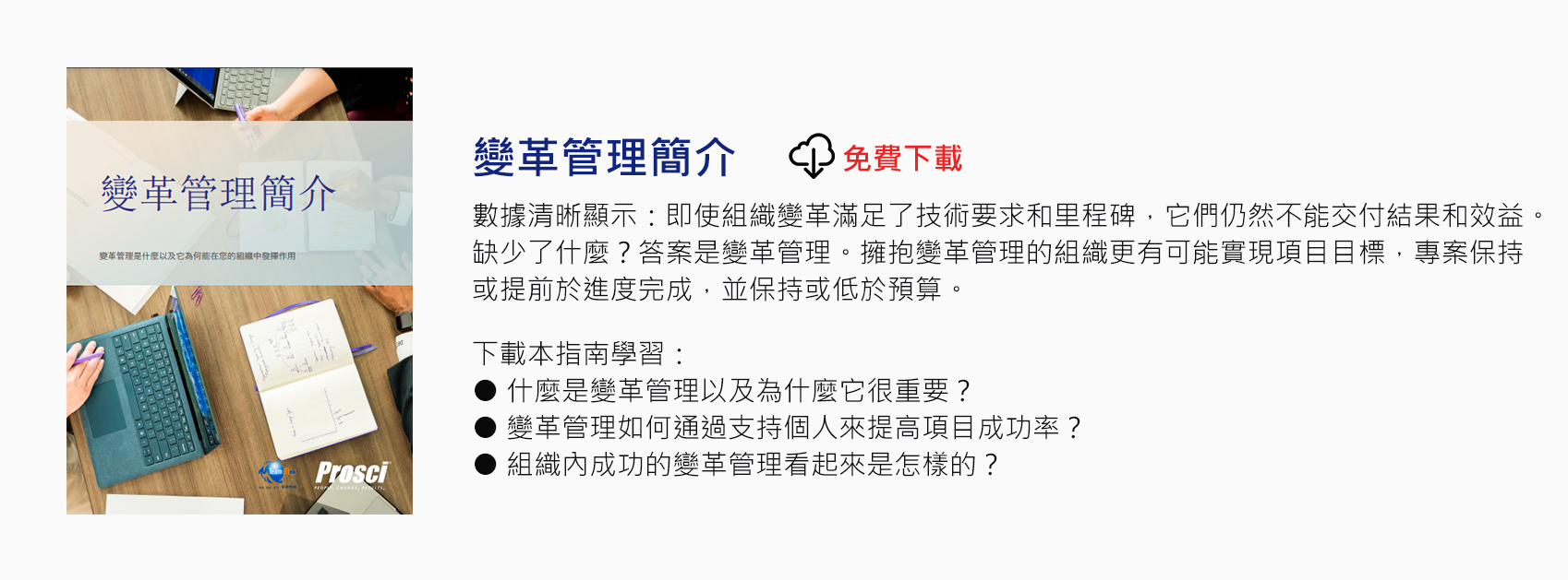 讓專業講師帶著您認識匯總 22 年來行業領先的研究報告「Prosci 變革管理最佳實踐總結報告― 第11版」的精華內容。