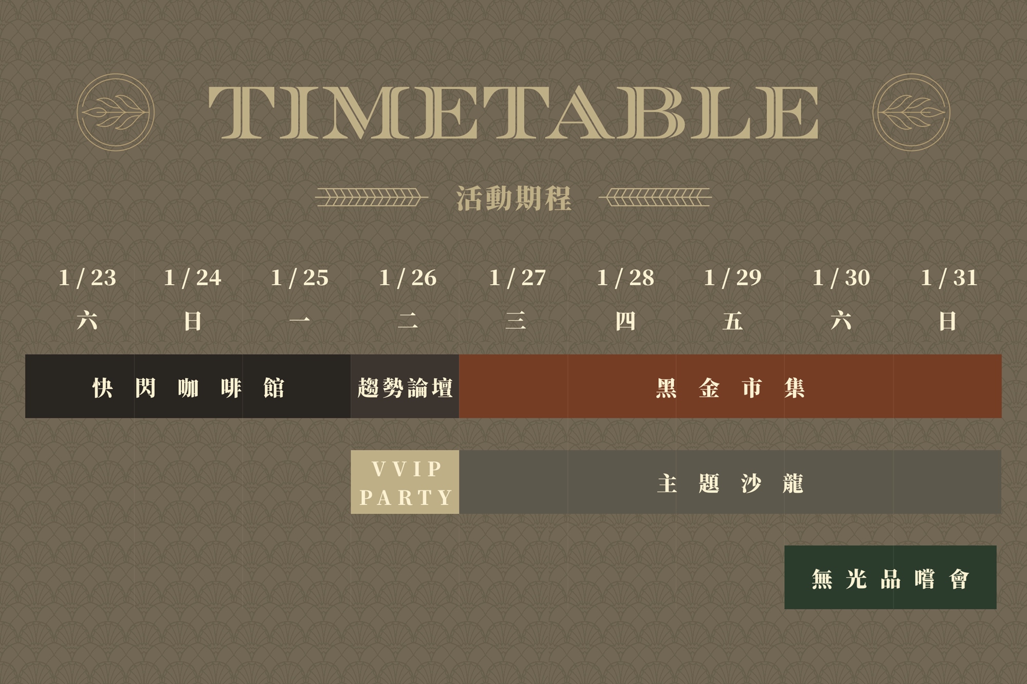 黑金派對活動將從 聯名快閃咖啡館(1/23-1/25) 拉開序幕,再由超高含金量的大師級對談 專業趨勢論壇(1/26) 接續,最後則是重頭戲 #黑金市集 (1/27-1/31) 壓軸展出。