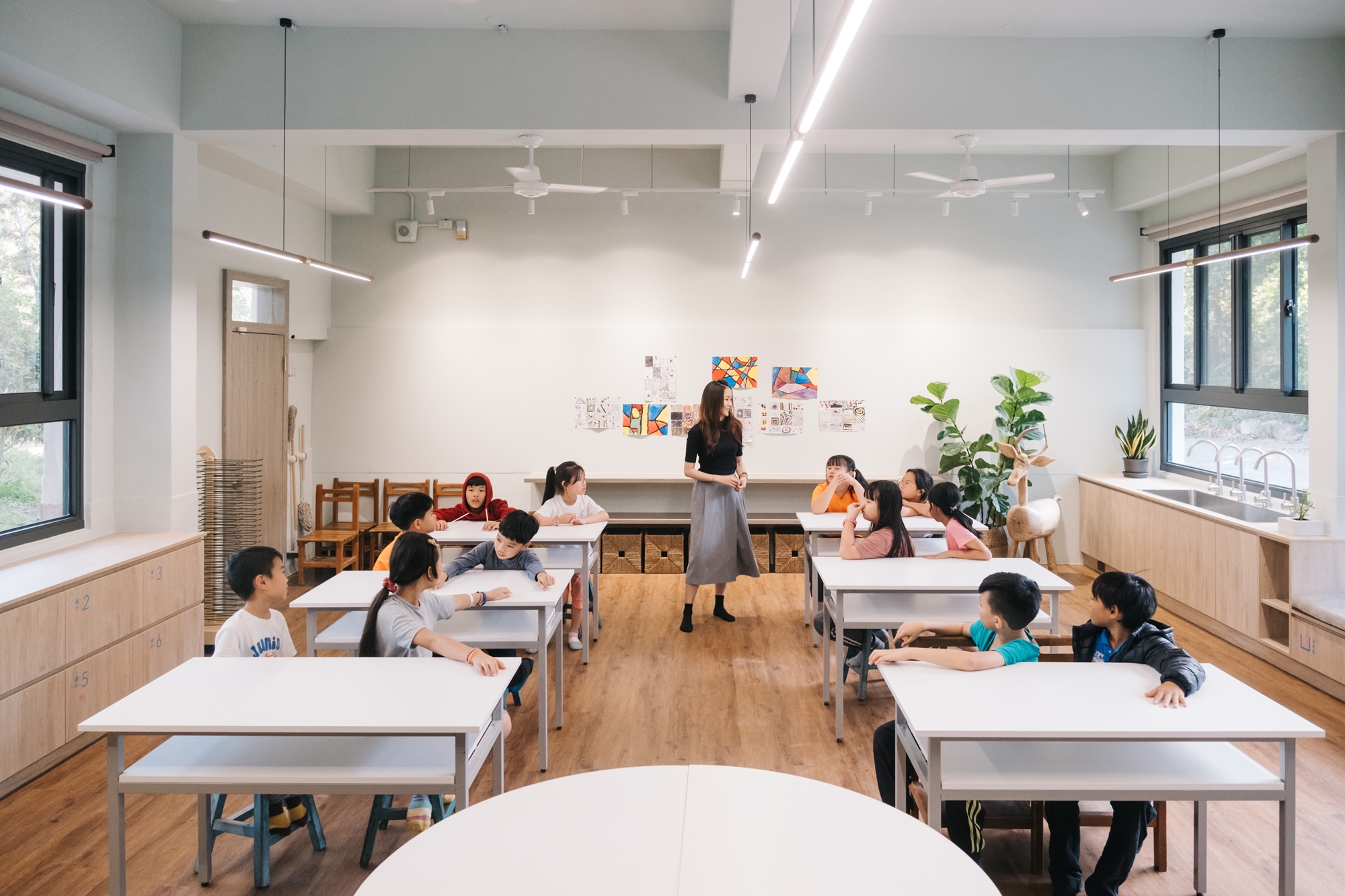 大象設計|改造台東永安國小的美感創作教室,可依課程需求自由排列組合的桌子、藏身在座椅和講台下的機能系統,同時也為各類美術用具規劃專屬的收納位置和識別。