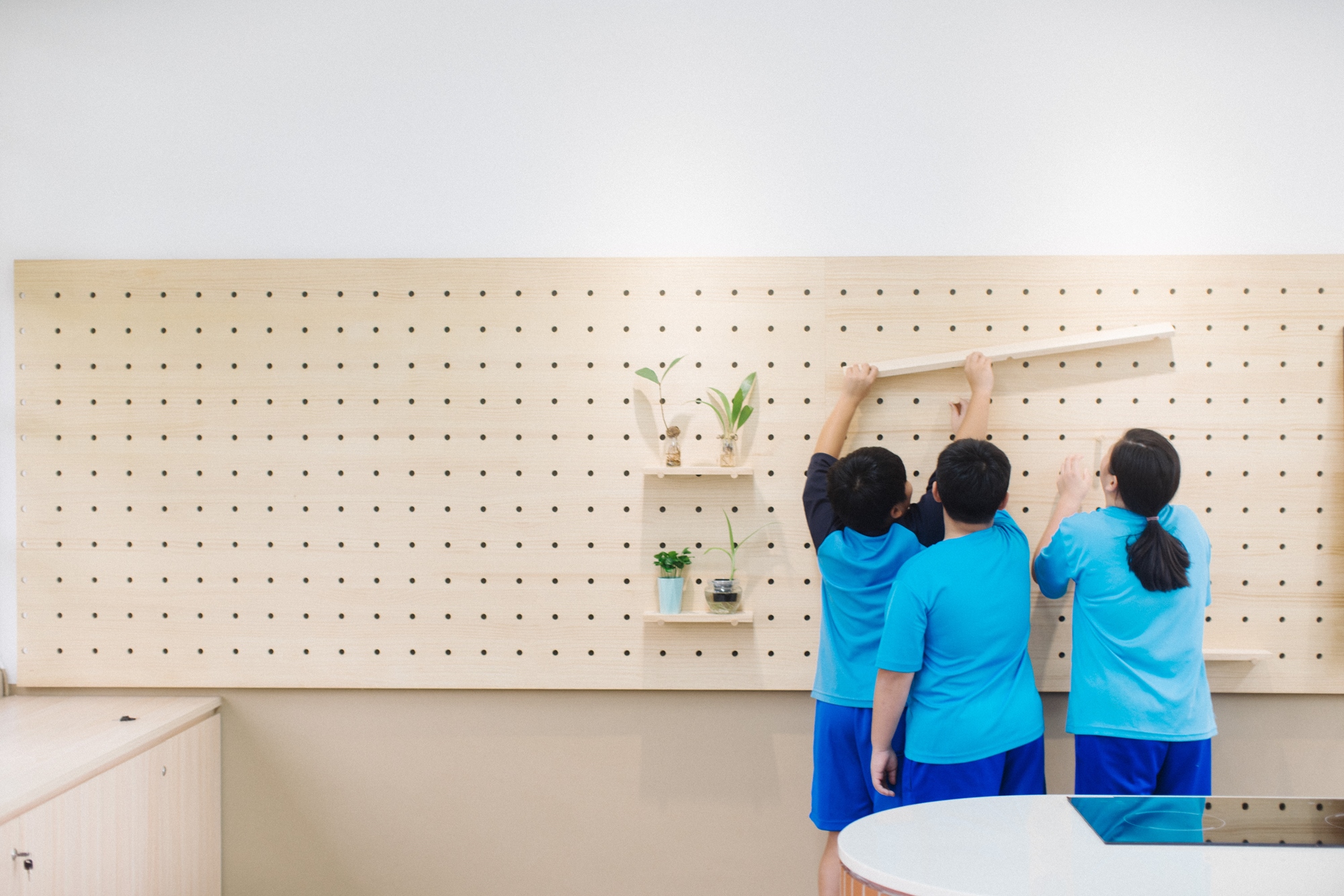 非常態空間製作所|將新北新泰國中的美感課程教室打造為美感實驗室,以黃金比例進行空間規劃,讓教室中島的清洗台兼具收納功能,還有可依需求自行排列組合的桌椅設計。