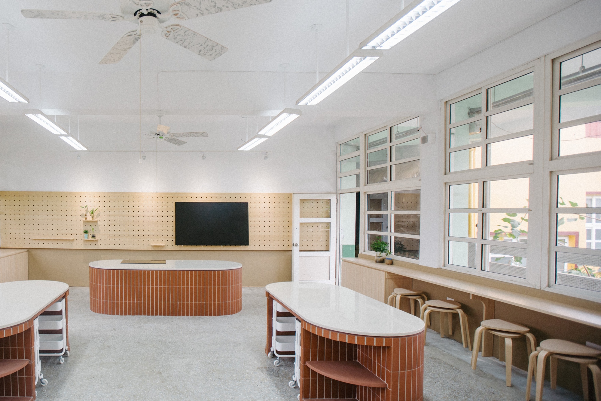 任室設計|以紅磚打造在地傳統的火灶意象,將高雄溪寮國小的烹飪教室透過設計導入複合材質,增加學生觸感的多元,同時加強展示與分類收納的機能性。