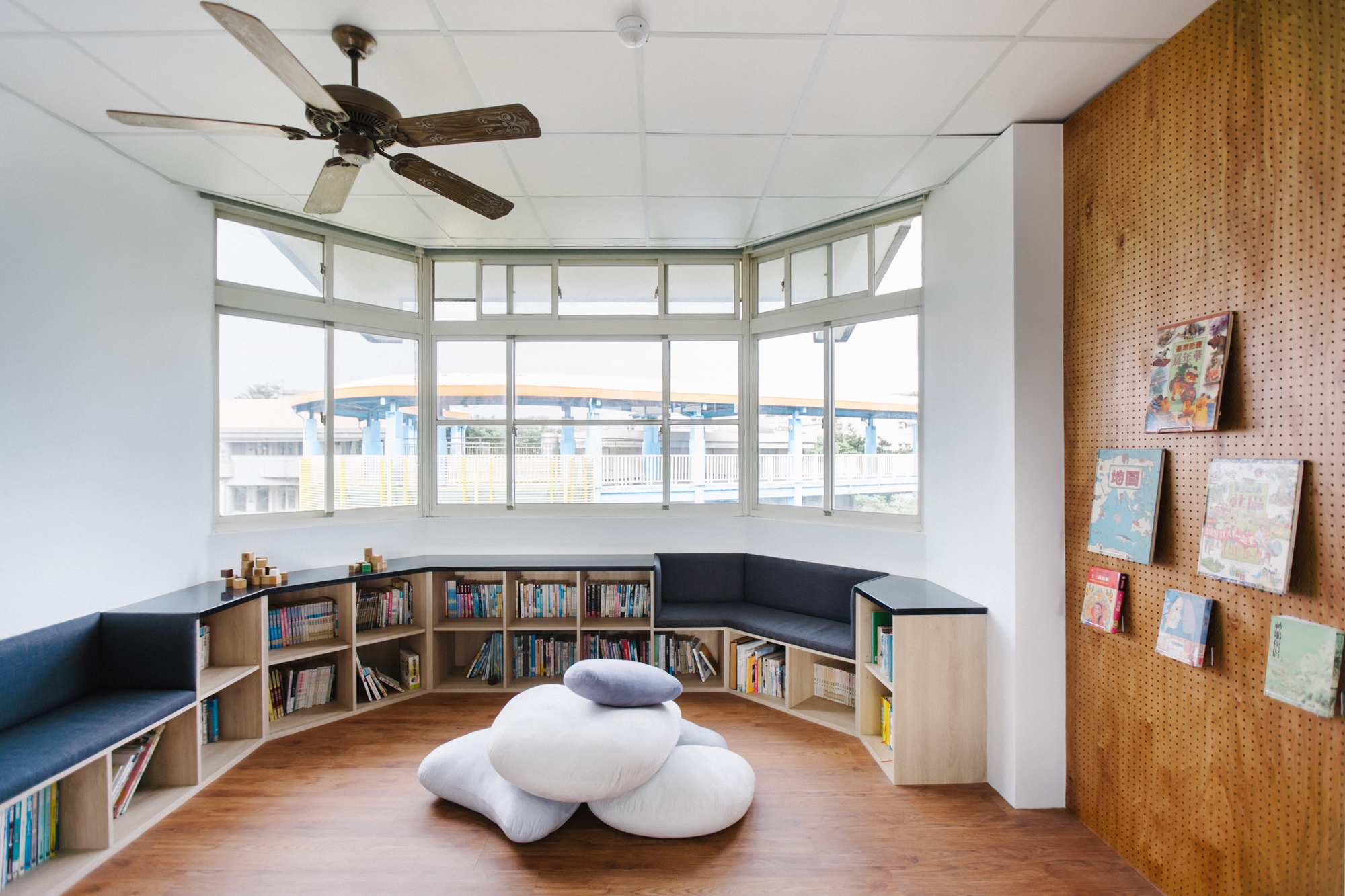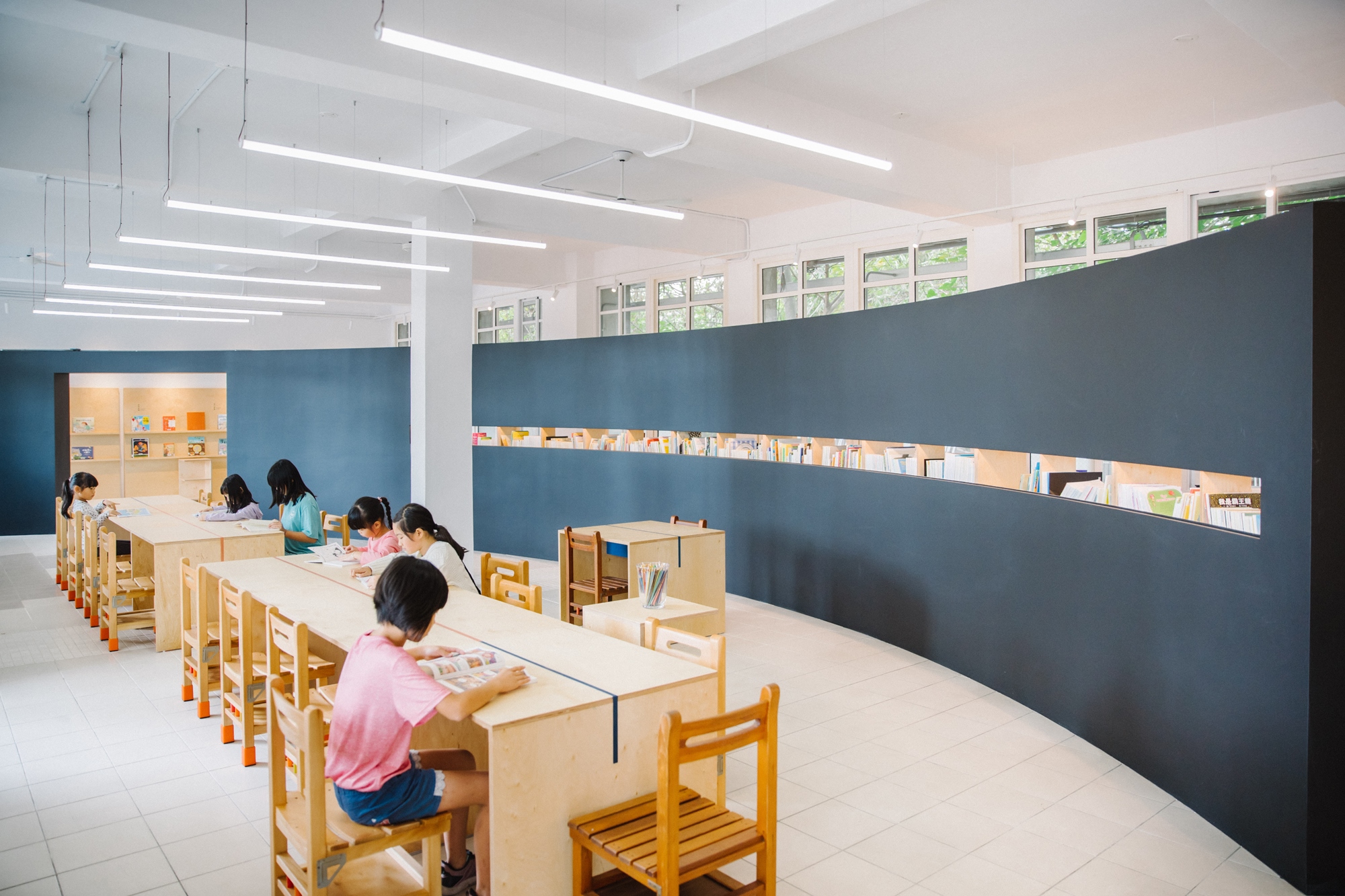 深活生活設計|將苗栗藍田國小的2間教室改造為圖書閱覽室,符合小學生身高的書櫃設計、更容易辨識的圖書分類系統以及適合閱讀的燈光,透過小細節讓空間大翻轉。