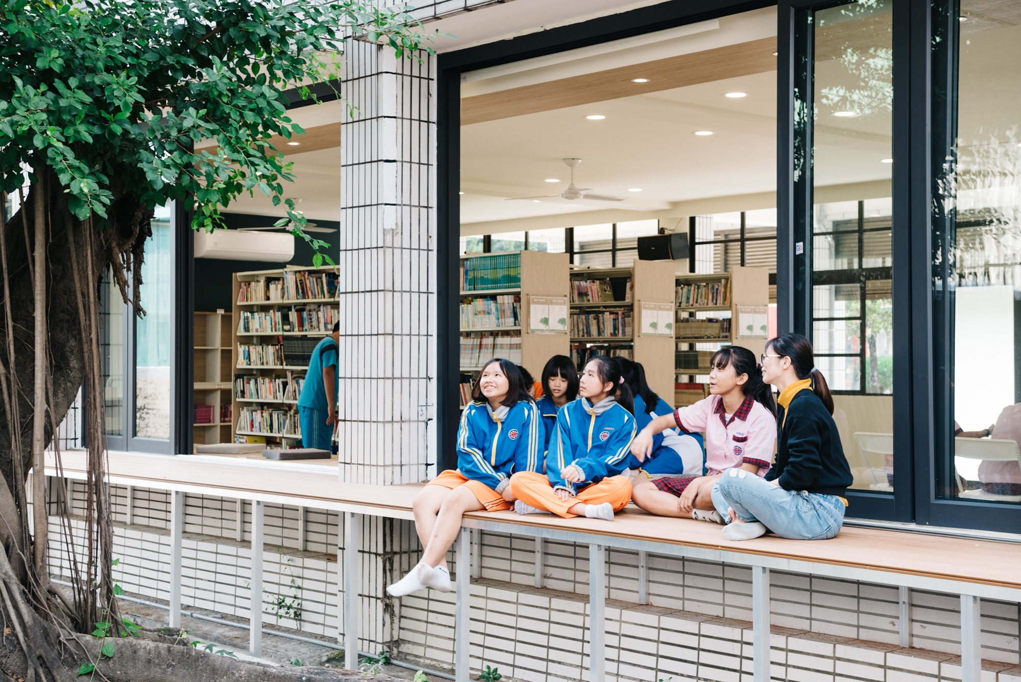 山川設計|將台南西港國中的視聽教室改造為圖書館,拆除原有階梯及輕鋼架天花板,打開牆面,讓孩子每一次的閱讀都有大自然的相伴。同樣也在台南的善化國中,團隊將視聽教室改造為交誼空間,運用原有的階梯打造出可自由利用的多層次平台。最後則是台南新興國小的展演空間改造,團隊重新賦予空間明確的意義,將其作為表演舞台與作品展示,利用黑板牆讓學生自由發揮創作,並改善通風與照明,讓學生在此創造回憶。