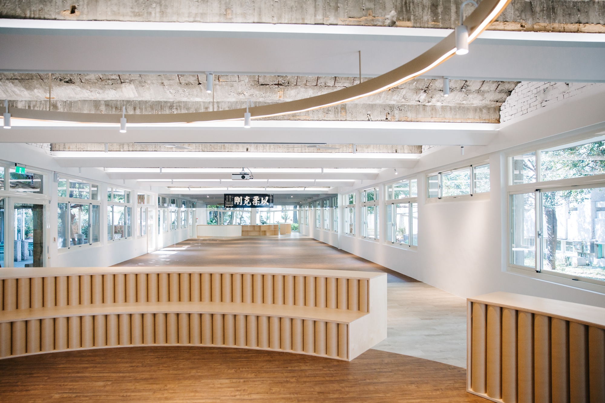 米索空間設計|將台中豐東國中的柔道角力館改造為校園多元展演中心,打開牆面,連接室內與戶外空間,拆除天花板輕鋼架,重現原生建築的美感,讓柔道角力館搖身一變,成為校園最具生命力的主角。