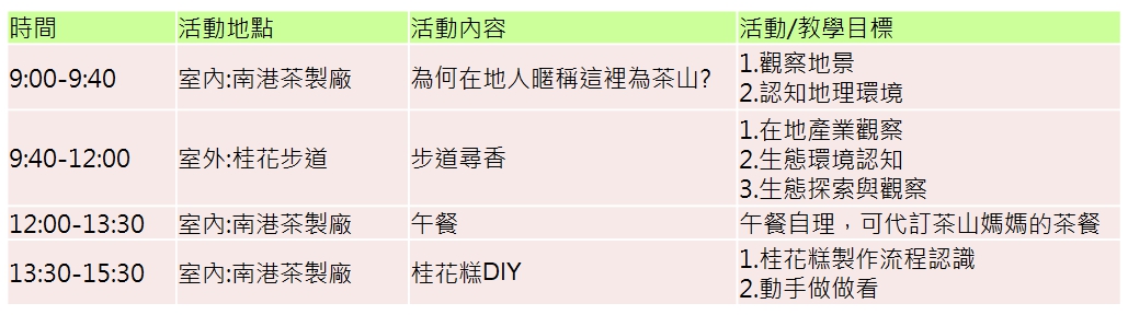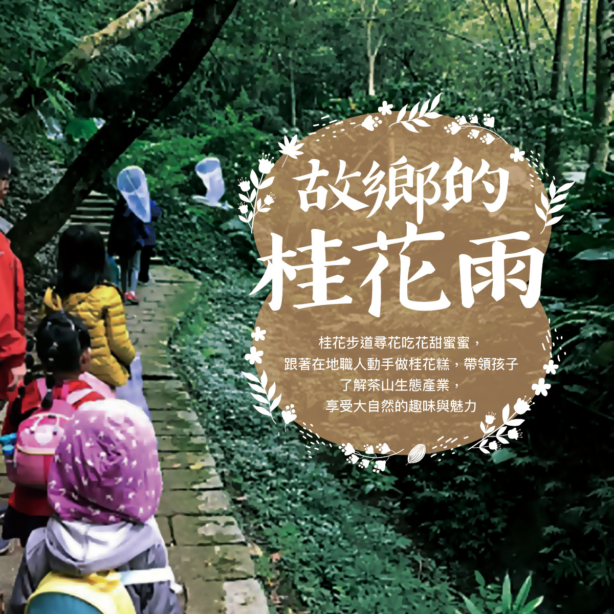 南港茶山步道尋花、採花,認識桂花的自然生態,認識桂花為何成為南港的區花,帶領孩子觀察茶山的地形與生態,了解這裡適應這裡的產業,與人們如何與大自然交互作用。