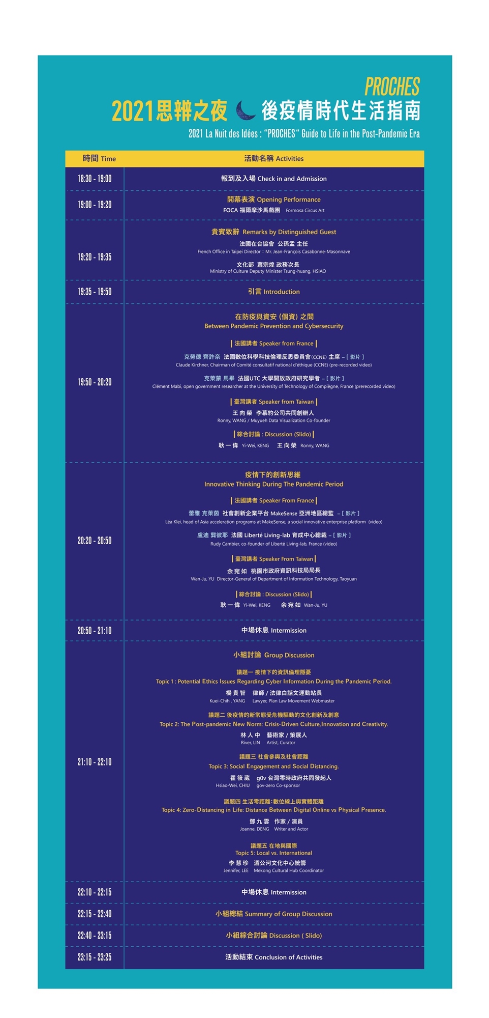 本屆思辨之夜將以法文「Proches (近身)」為主題,並分別針對:「疫情下的資訊倫理隱憂」、「後疫情的新常態:受危機驅動的文化、創新及創意」、「社會參與及社會距離」、「 生活零距離:數位線上與實體距離」及「在地與國際」等子題,一同探究疫情時代下「社交距離」所帶來的影響。為控制疫情發展,國家公權力强制性置入「社交距離」,從而改寫了每一社會分子的人際關係與相處模式,一個生活新常態儼然而生,形成一股不可忽視的趨勢。居家隔離無形中放慢了時間,人們開始思考生命與生活的價值:如何在被限制的情況下,保持原有的社會網絡及人際交流品質?而企業及其它單位團體,能否能在「新常態」中找尋到商機?人們在工作、教育、生活和休閒娛樂上還有什麼樣新的可能性 ?