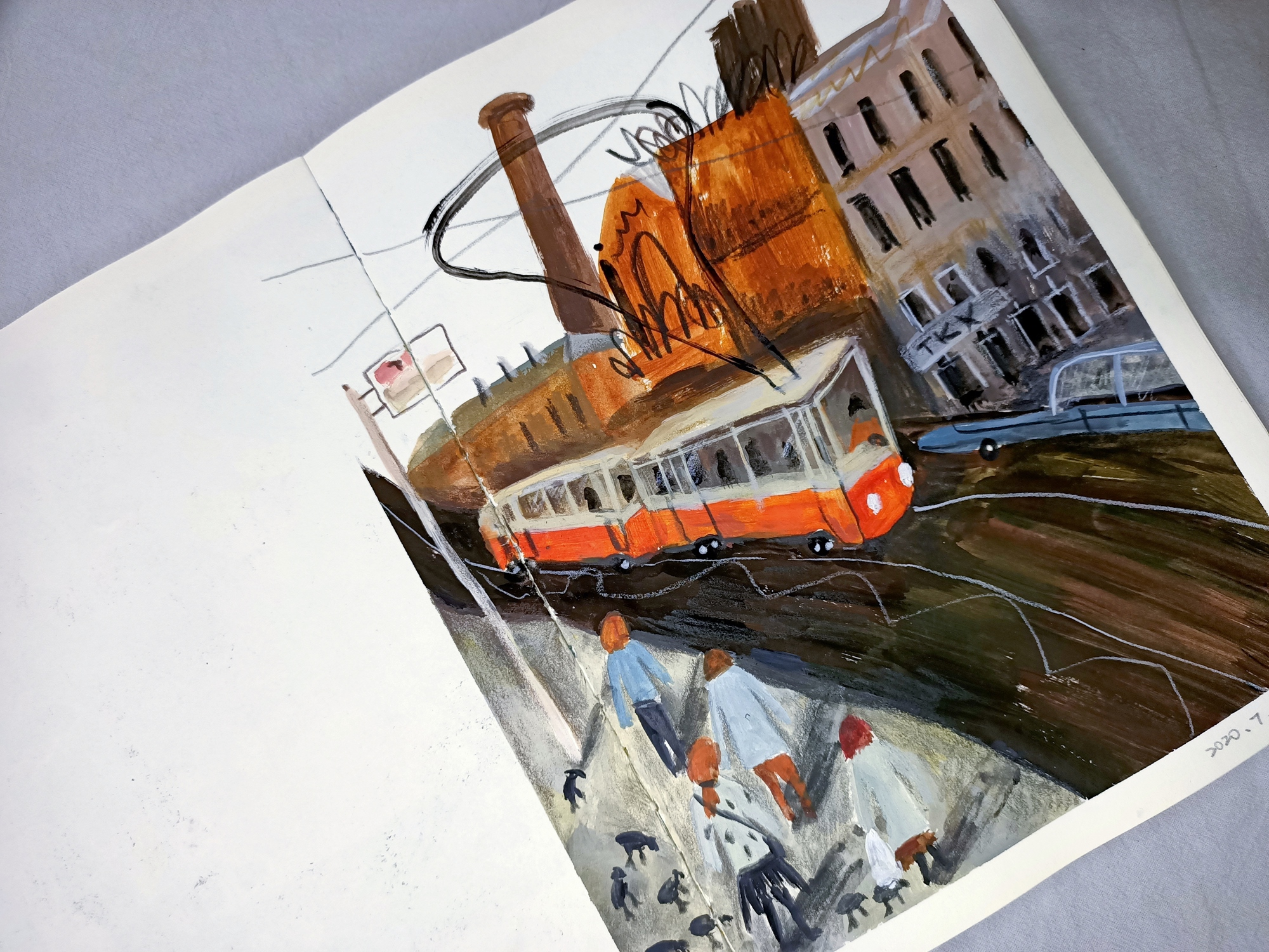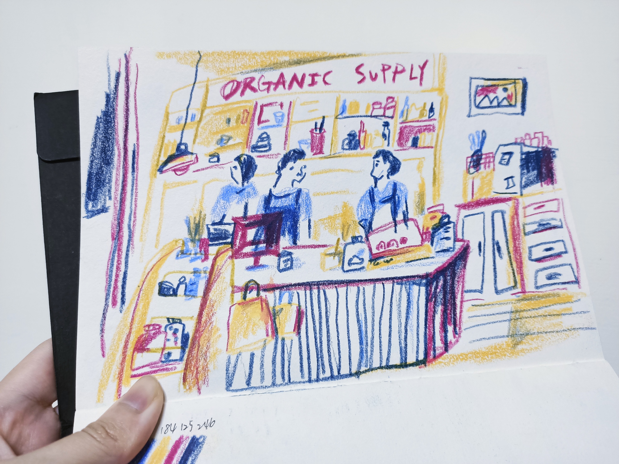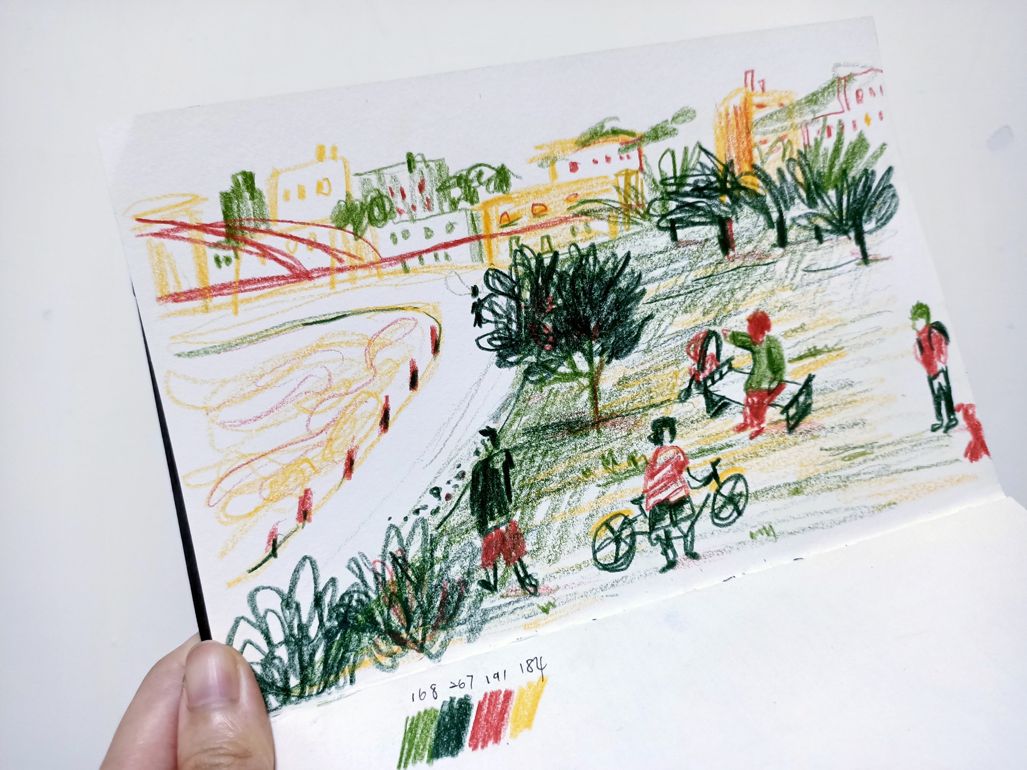 我們練習使用有限的色盤,結合線條與形狀的概念,並在實景裡觀察景與人,使用這些有限的色盤在構圖中,理解顏色所表達的情緒與狀態,以及顏色的搭配。