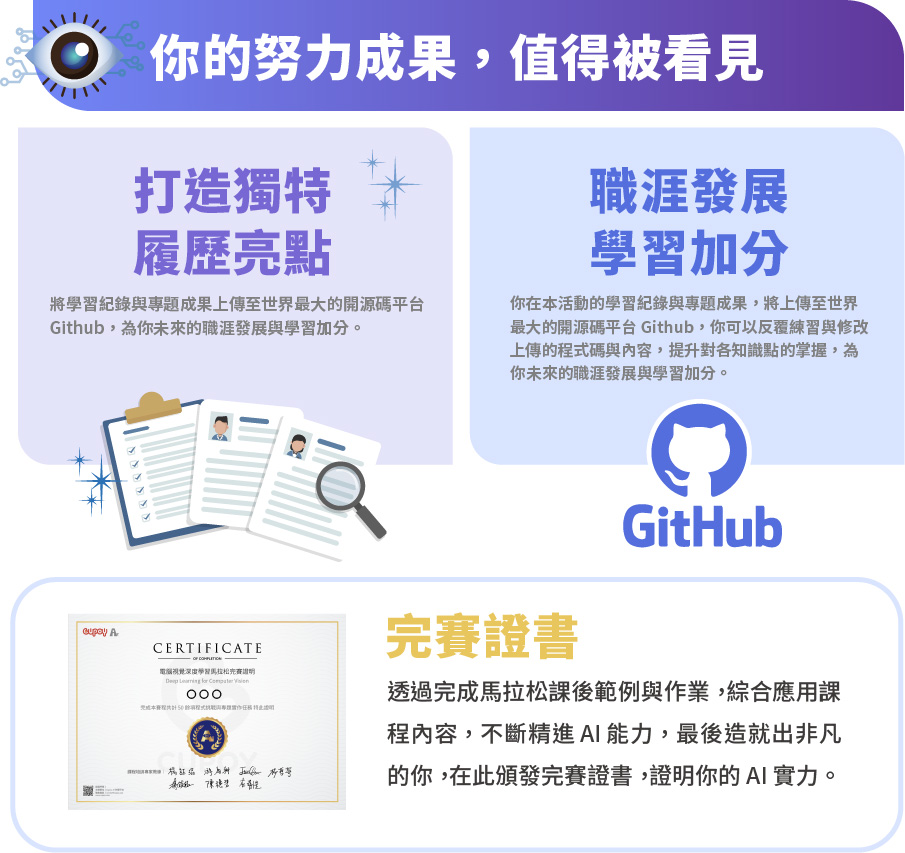 - 「電腦視覺深度學習馬拉松」專家陪跑計畫,整理了 50 多個電腦視覺與深度學習的重要知識點,是以自主學習加上翻轉教育的方式引導用戶學習,並輔以業界專家協助回答學員在學習過程中的疑難雜症,希望以社群學習的方式加速學員在學習 AI 的速度與快速累積實戰基礎能力。