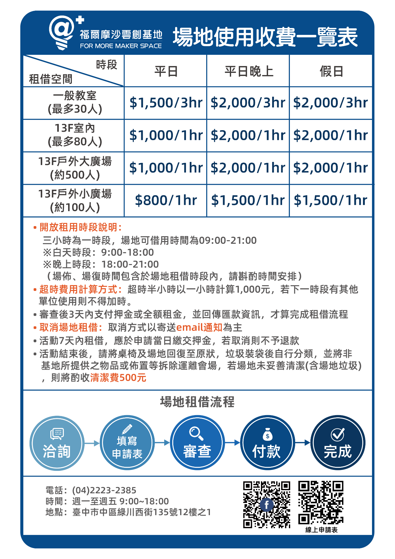 1. 請事先確認欲租借時段之場地是否已有預約:https://formoremaker.pse.is/3be4ny