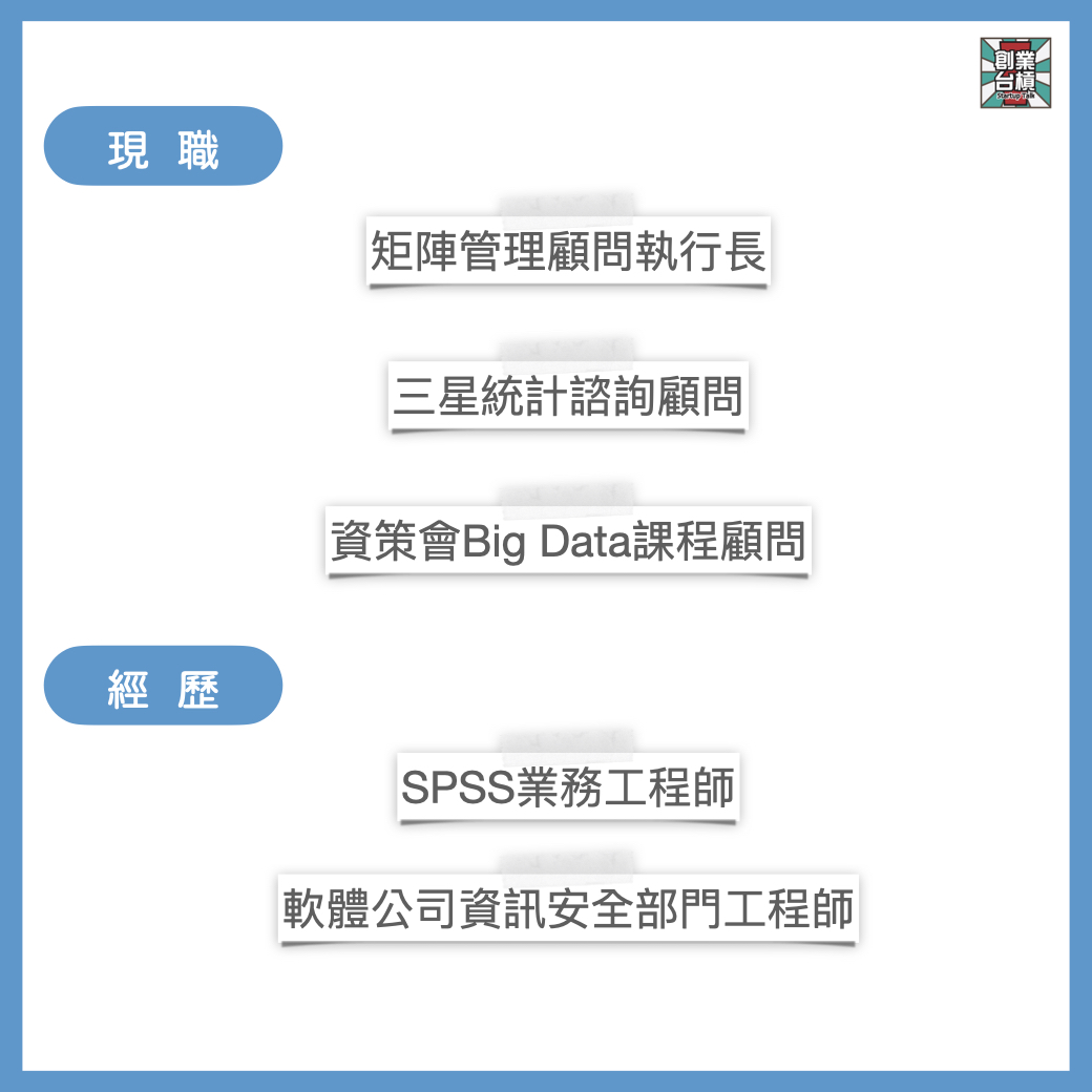 曾任SPSS業務工程師,軟體公司資訊安全部門工程師,現任矩陣管理顧問執行長,三星統計諮詢顧問,資策會Big Data課程顧問。