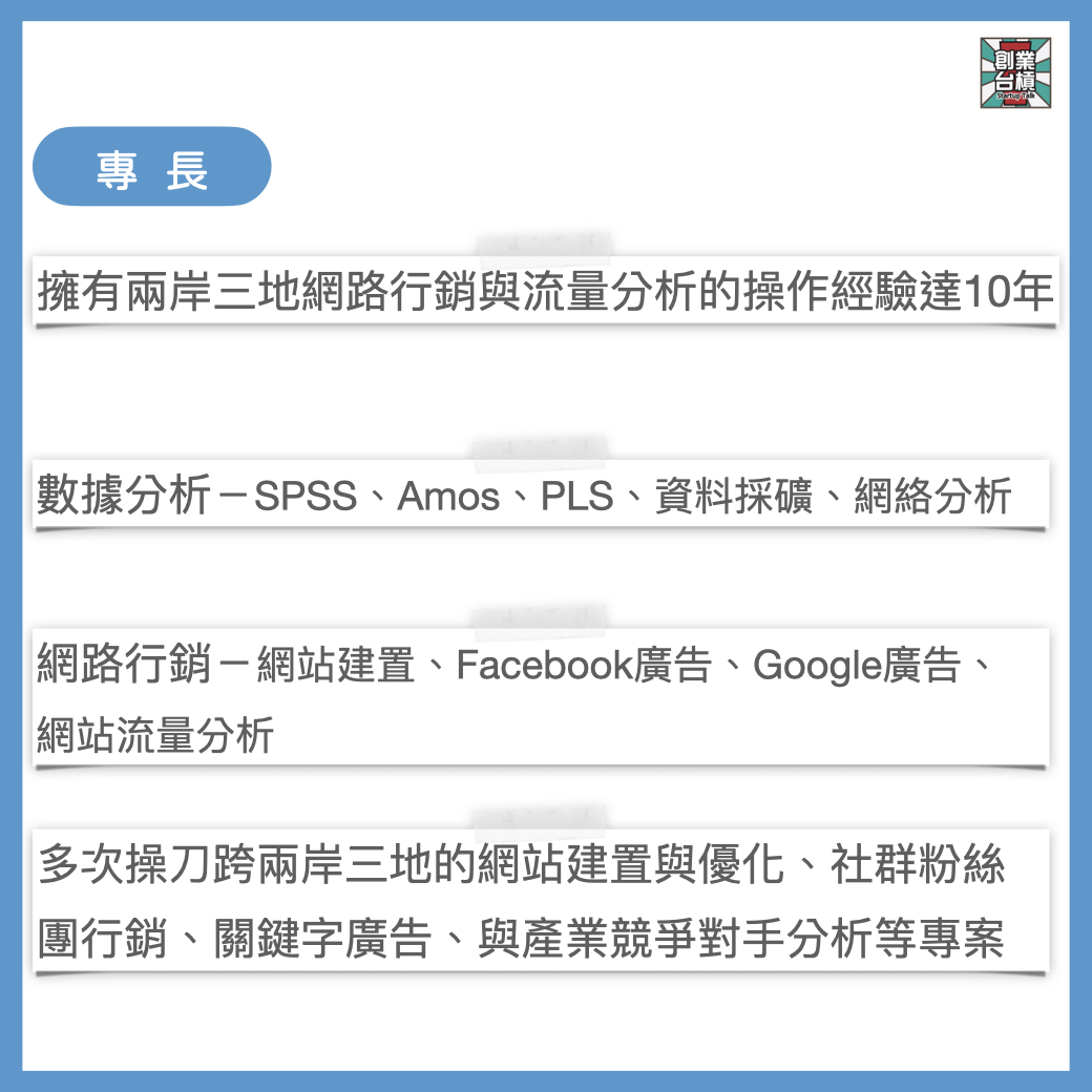 擁有兩岸三地網路行銷與流量分析的操作經驗達10年,長於數據分析(SPSS、Amos、PLS、資料採礦、網絡分析)與網路行銷(網站建置、Facebook廣告、Google廣告、網站流量分析)。多次操刀跨兩岸三地的網站建置與優化、社群粉絲團行銷、關鍵字廣告、與產業競爭對手分析等專案。