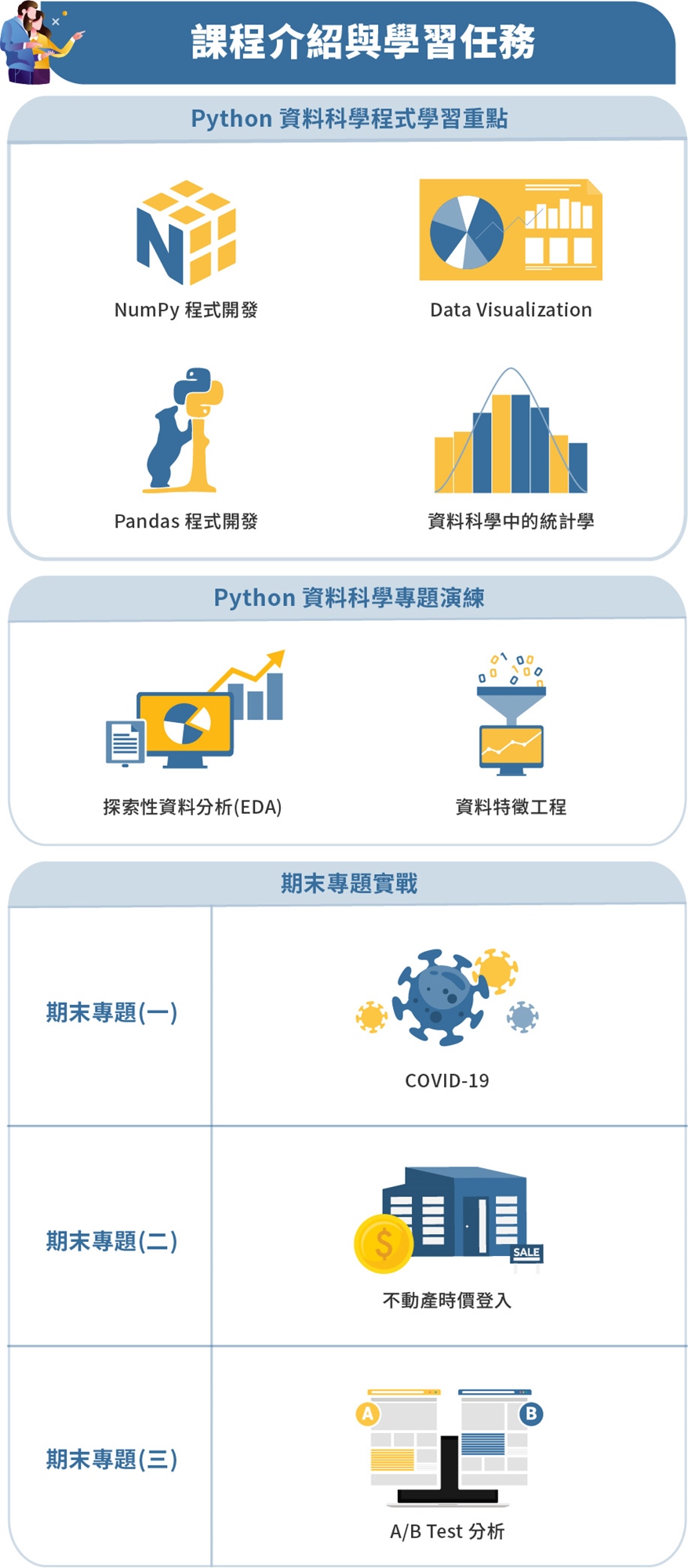 - 一次讓你了解如何應用 Python 解決各種資料科學的問題,本課程將完整教你如何開發 Python Data Science Programming:Numpy 陣列操作、數學函數與統計函數、I/O、結構化陣列
