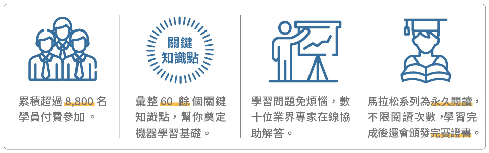 AI 學習馬拉松系列購買完成後,即可永久閱讀,不限閱讀次數,學習完成後還會頒發完賽證書。已累積共超過 8,800 多位學員參與,想要與專家與同好一起學習的朋友,這次要把握機會報名。本屆馬拉松除了有更多 AI 專家加入、原有教材再升級,提供更多延伸閱讀,幫你更有系統掌握 AI 知識。