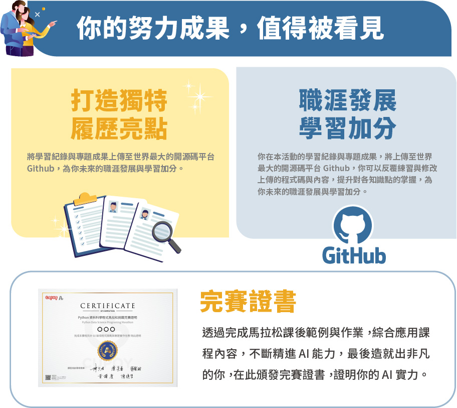 - 你在本活動的學習紀錄與專題成果,將上傳至世界最大的開源碼平台 Github,你可以反覆練習與修改上傳的程式碼,提升對各知識點的掌握,而這些紀錄將為你未來的職涯發展與學習加分。