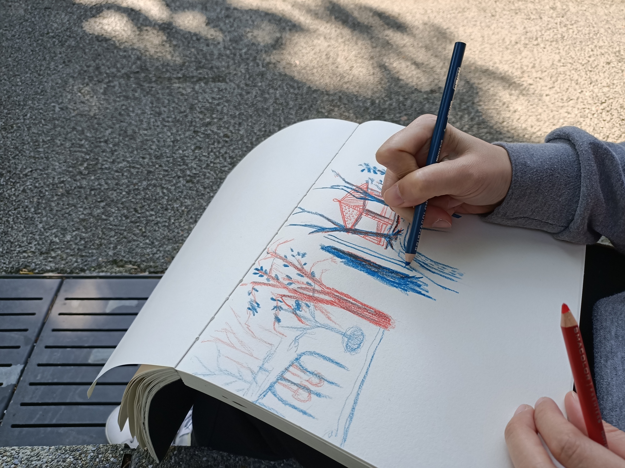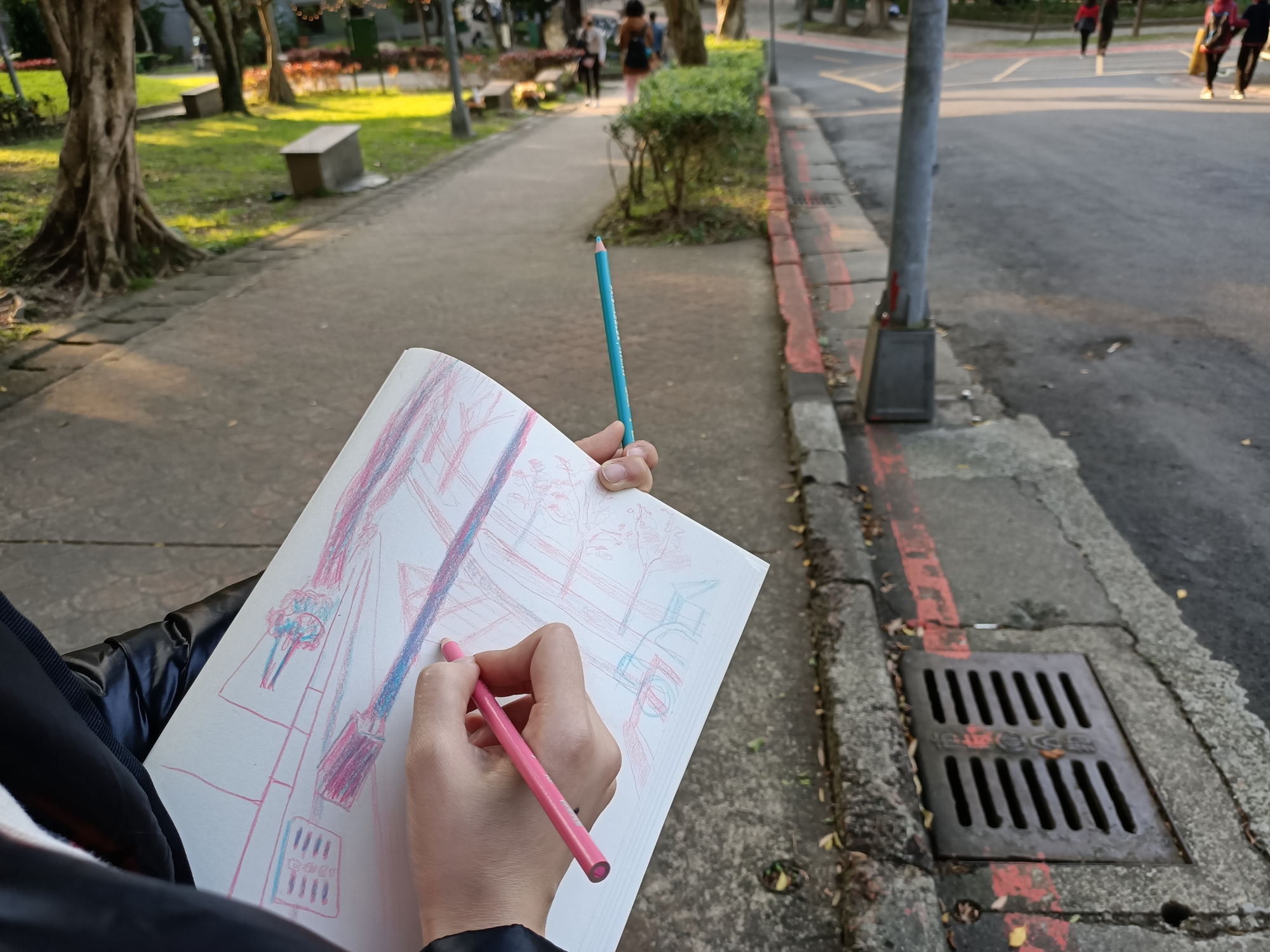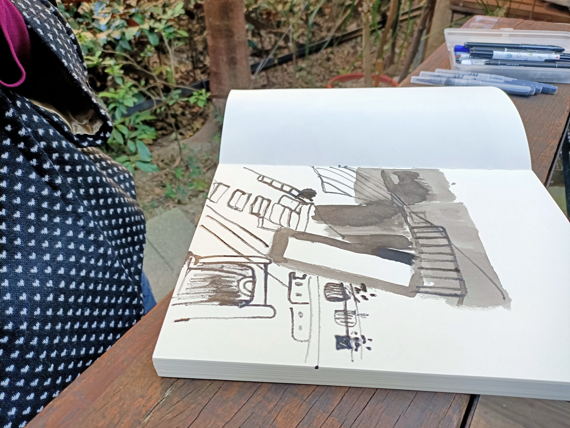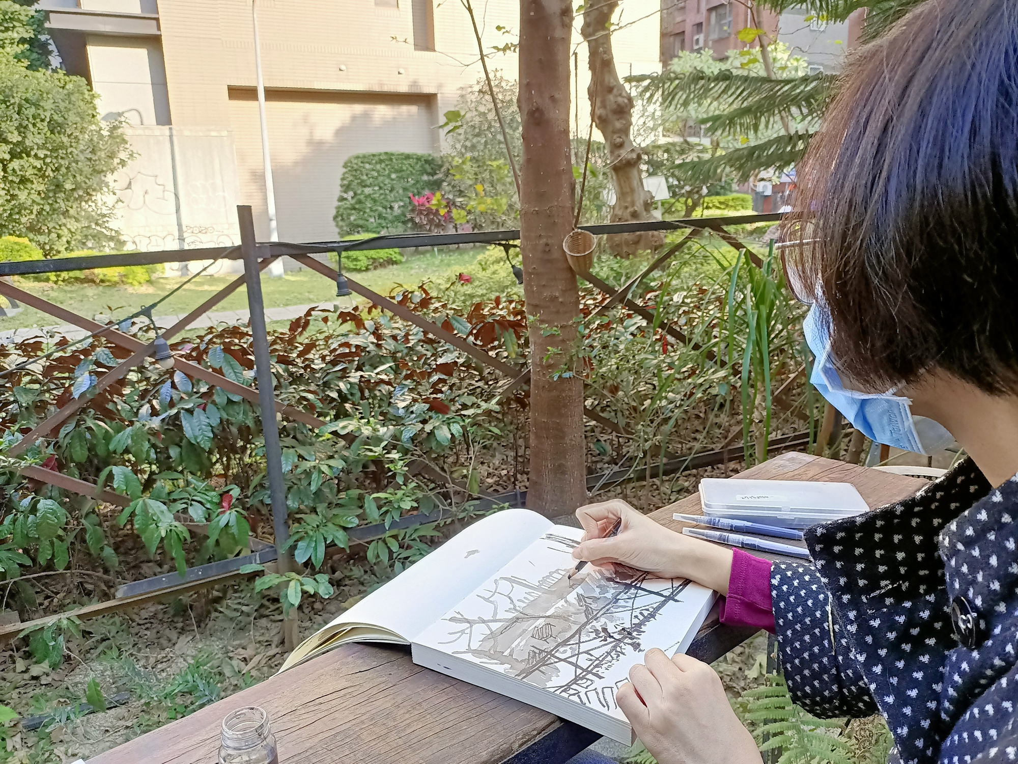 ➤前2個小時會帶著學生從零練習怎麼觀察,並使用自己手邊帶來的筆暖身與熟悉怎麼從近的東西到遠的場景構圖,目的是要帶學生活用自己手邊的素材,因為有些人可能有很多媒材卻不知道該如何使用,增加自己日常可以隨手練習畫畫的容易度。