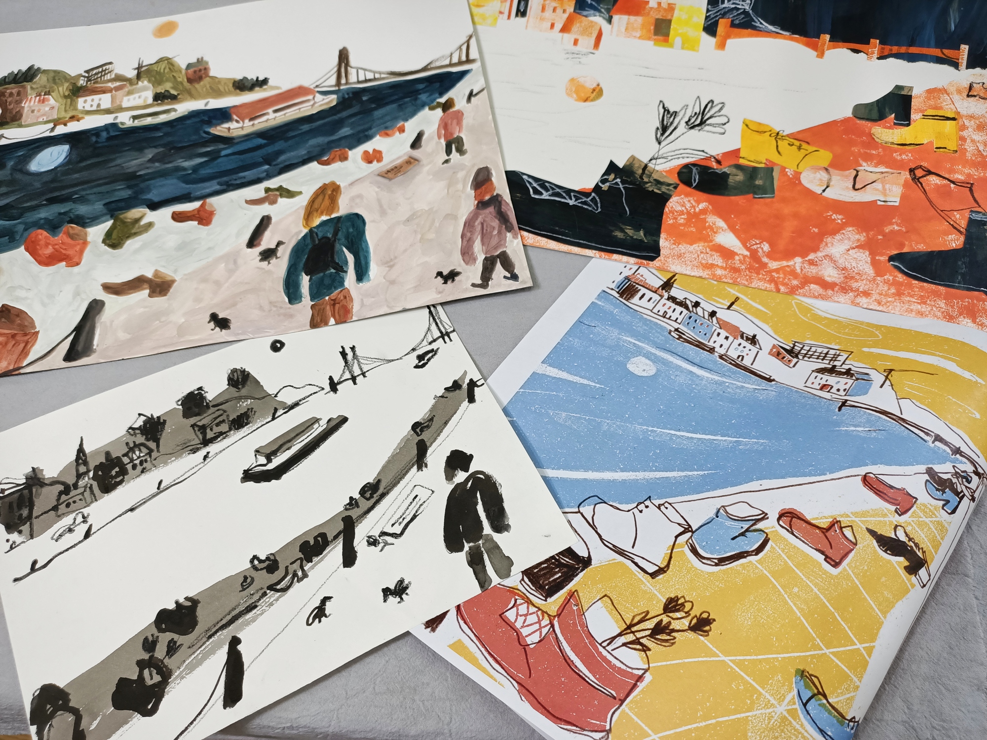 在英國學習的旅程中,起初我以為插畫與繪本的學習重點在於無中生有的想像力,但事實上我們課程的前兩個月,老師都在讓我們大量練習生活裡的觀察力與速寫(約7本40頁的速寫本),直到第三個月開始老師才帶我們練習用前兩個月的速寫本作為想像力與發想素材的基底。這時我才明白為何過去在畫畫或是做平面設計時,常常會沒有靈感或面臨乾枯的情形,因為所有形式的故事表達都是來自我們對生活的觀察、理解、感受與體驗,插畫只是一種視覺呈現的方式以及內在感受的表達,所以現在不論是在做繪本或是視覺設計相關的內容,我都會先進行大量的生活實際速寫的取材過程,包含觀察速寫、色彩的搭配、媒材的實驗以及故事板的構想,藉以作為靈感的激發,甚至去旅行時,我也會用插畫速寫來紀錄心情,如同一位插畫的記錄者、探勘者與實驗者。