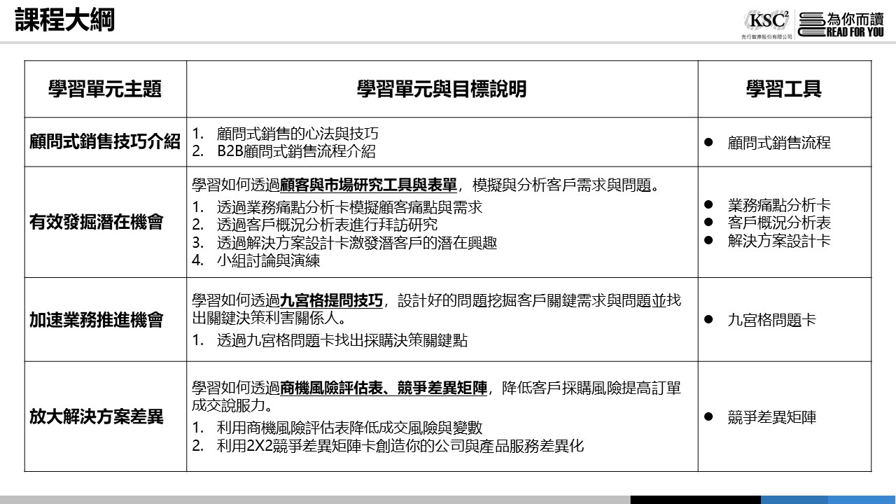 ▍你在業務開發上是否有遇過這些狀況? ◎ 如何陌生開發客戶及挖掘潛在客戶的不同需求? ◎ 不懂得如何開價及議價,並判讀客戶的肢體語言? ◎ 如何在客戶提案會議後推一把並實際獲取訂單? |