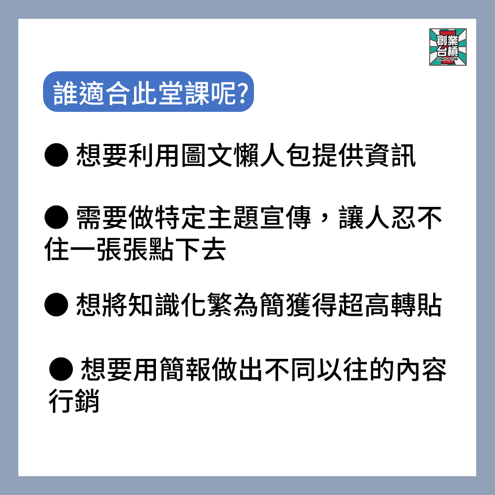 不論你是自媒體、社群小編、或是有特定主題宣傳的人,你將學會從零開始打造一部完整的圖文懶人包!