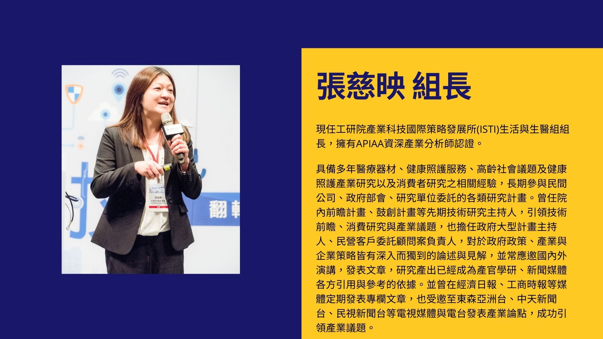 | 11:15~12:00 | 專題演講(三) AI在健康醫療產業的應用趨勢 | 張慈映 組長 工研院之產業科技國際策略發展所, 生活與生醫組 |