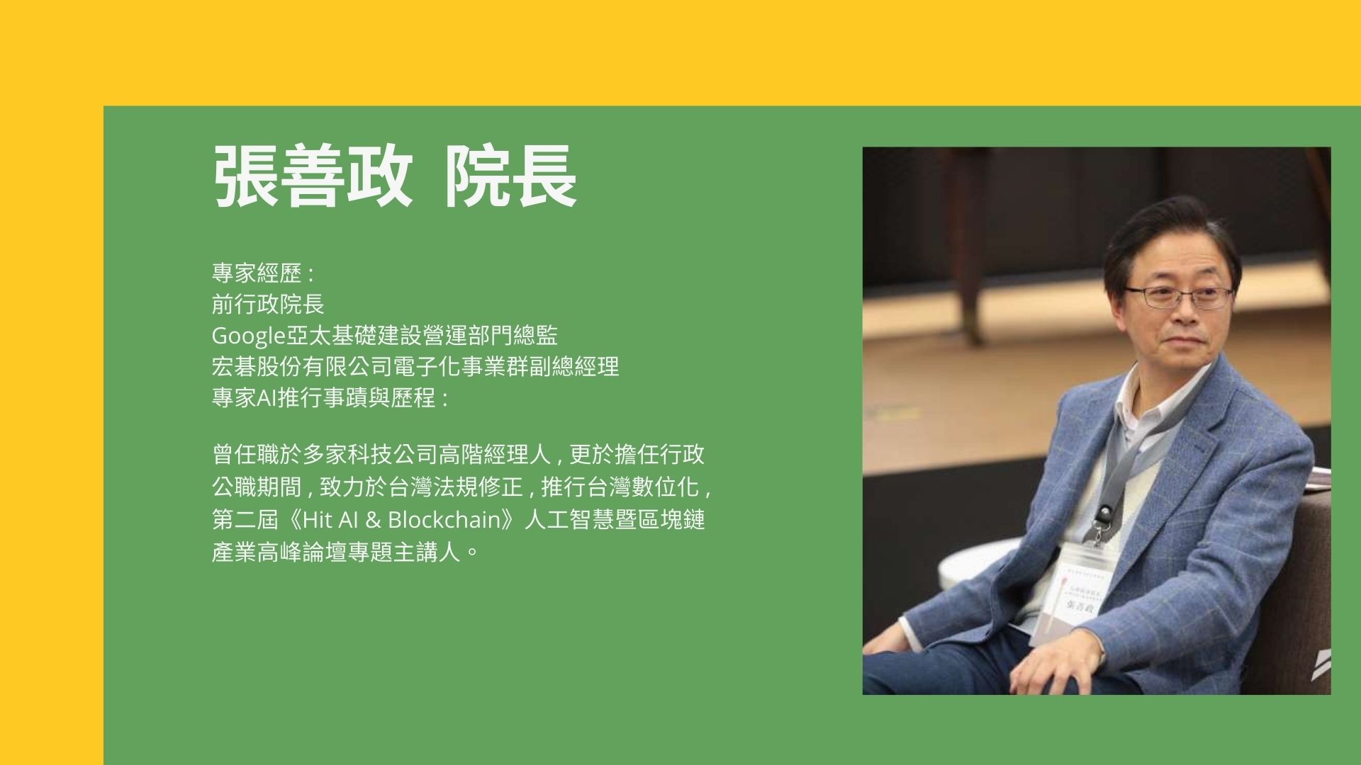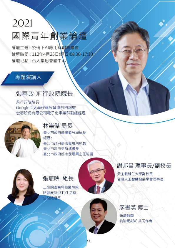 | 09:25~10:10 | 專題演講(一) 疫情下,台灣在AI產業的契機和新思維 | 張善政 前行政院院長 |