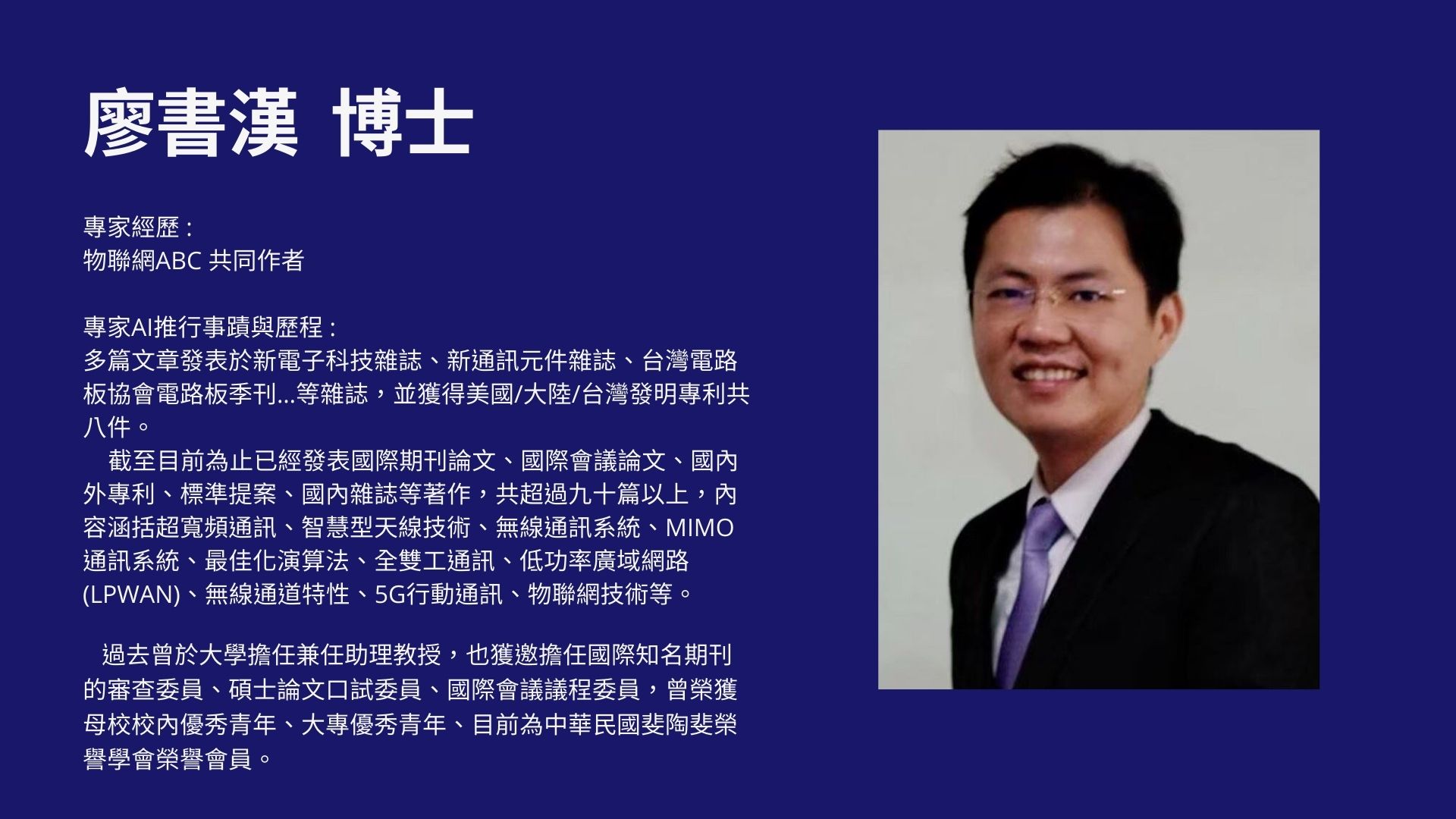 | 10:30~11:15 | 專題演講(二) 5G時代來臨: 人工智慧之挑戰與機會 | 廖書漢 博士 物聯網ABC(AI、Big Data & Cloud)的共同作者 |