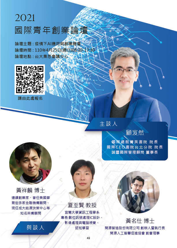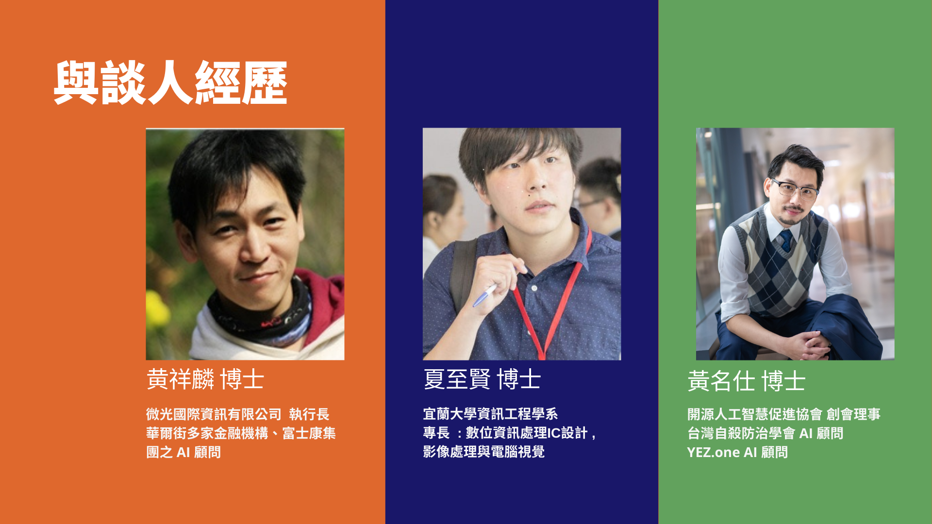 | 主談人: 顧岌然 台灣創速股份有限公司 執行合夥人 與談人: (1) 黃祥麟 博士 / 創辦人 微光國際資訊有限公司 (2) 夏至賢 博士 宜蘭大學 教授 (3) 黃名仕 博士 開源人工智慧促進協會 創會理事 |