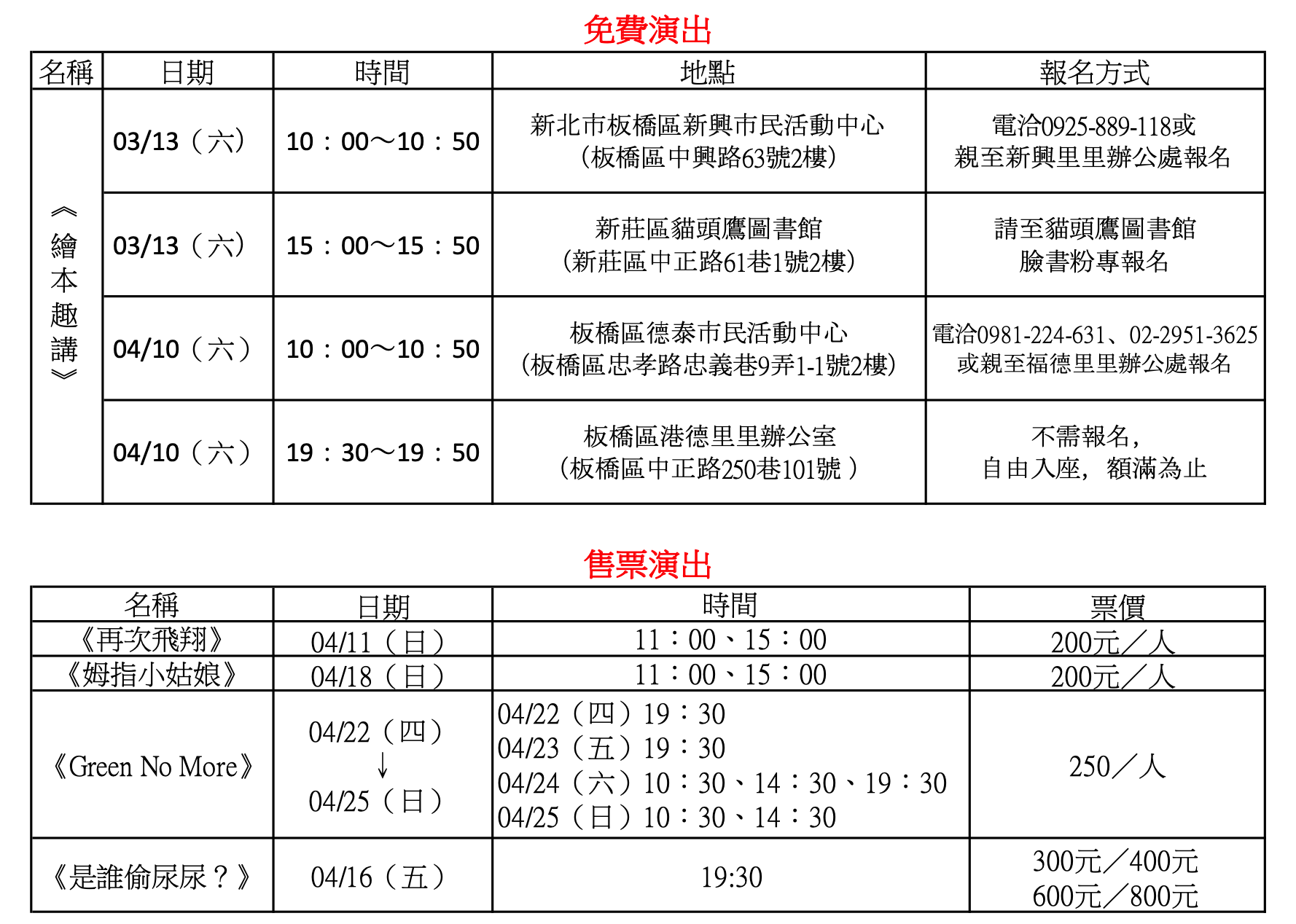 四齣戲劇演出:《是誰偷尿尿?》《再次飛翔》《姆指小姑娘》《繪本趣講》
