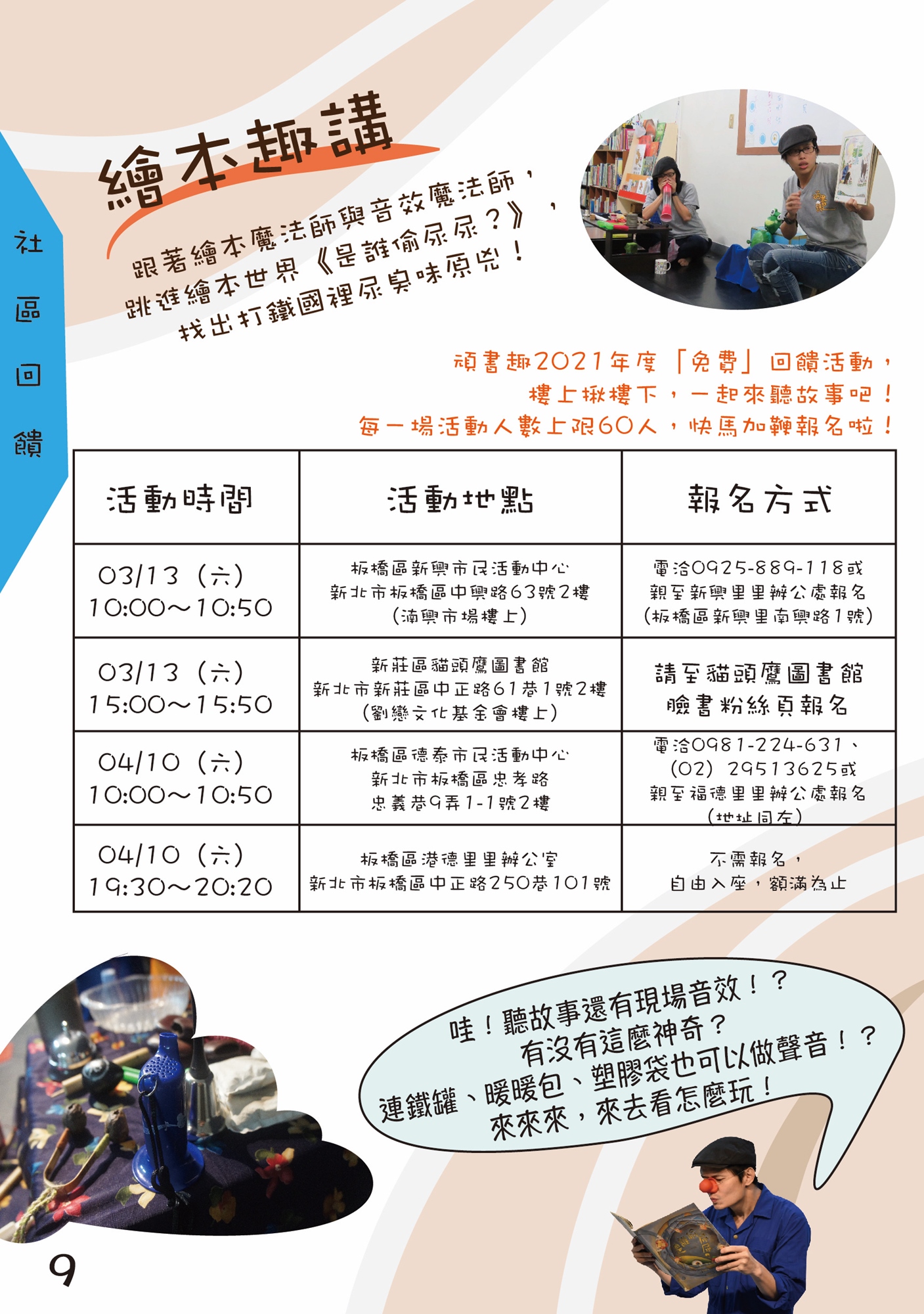 四場回饋活動:板橋港德里、板橋新興里、板橋福德里、新莊貓頭鷹圖書館