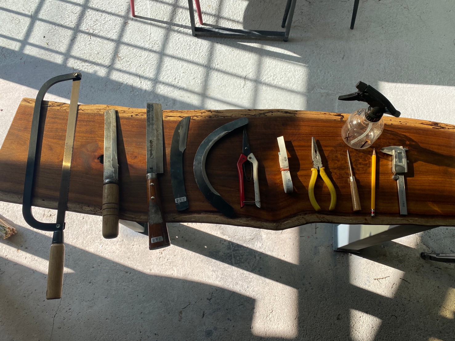 學員自備工具:鋸弓、剖竹刀(左二,清明節鋤草那種也可以)、枝剪、布尺、小鑽頭、鉗子、噴水瓶