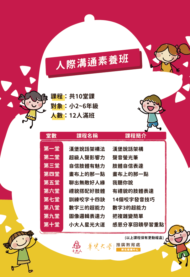 這是一堂躲不掉的人生必修課,若從小就引導孩子養成好好說話的習慣,讓好的溝通表達在孩子人際關係中發揮作用!無論是上台報告、參與活動、面對舞台時更有自信,搭配好的肢體語言、聲音表情、思考及邏輯力,相信對孩子的未來會有更全面的提升!讓我們為孩子搭配一對軟實力的翅膀,使孩子們能自信表達、自在溝通!