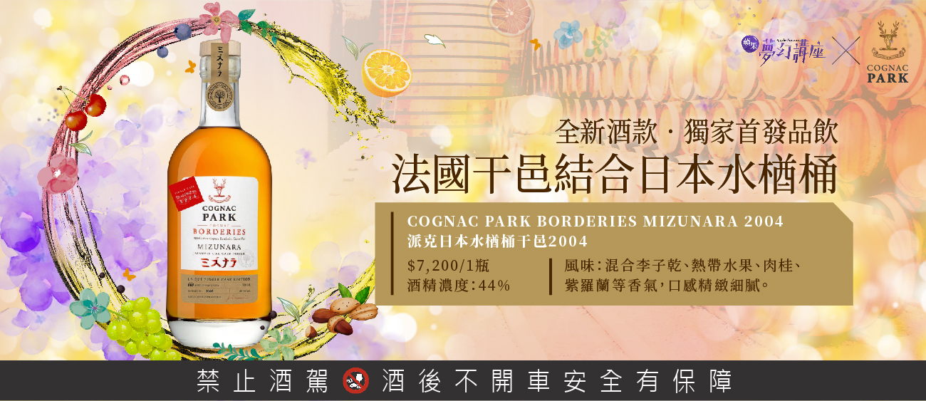 全新Mizunara系列:COGNAC PARK BORDERIES MIZUNARA 2004甫於今年初新上市,全球僅528瓶,這次特別搶在夢幻講座獨家曝光、首次提供品飲!