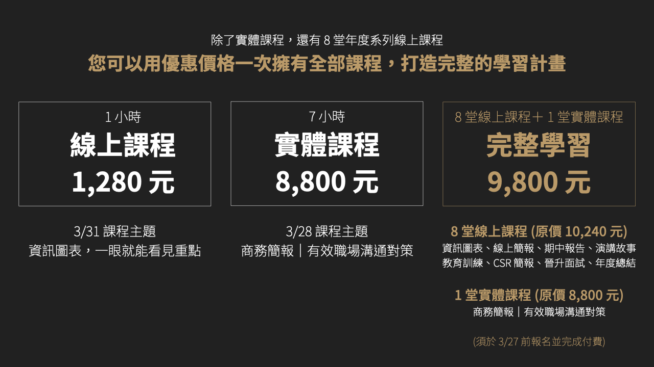 即日起至 3 / 27,您可以用優惠價格一次擁有全部課程,包含全年度 8 堂線上課程,再加贈一堂 7 小時的實體課程,為您打造完整的學習計畫 ! 線上課程可無限回放,在任何時間都能完整學習。