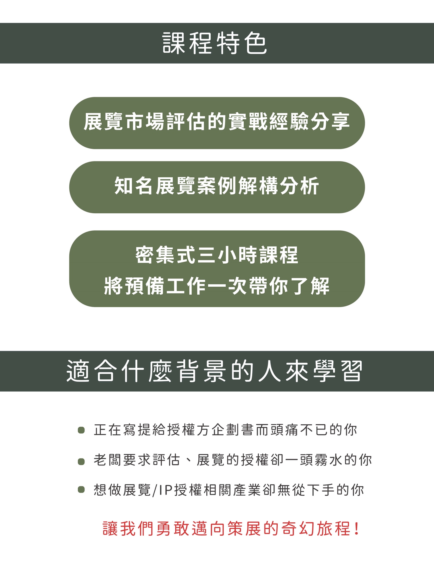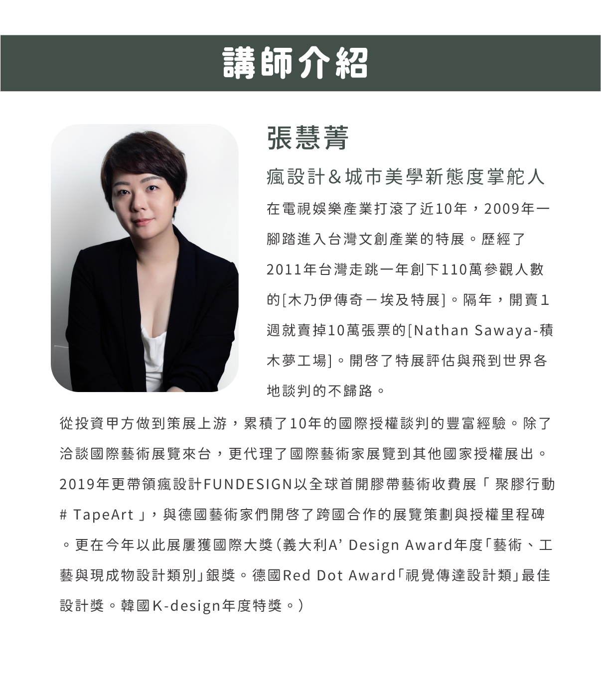 透過策展人張慧菁多年的豐富經驗,首先了解授權合作模式、類別、角色,並分享國內外藝術品、展覽、圖像授權的豐富case study,帶你踏進策展的第一步!
