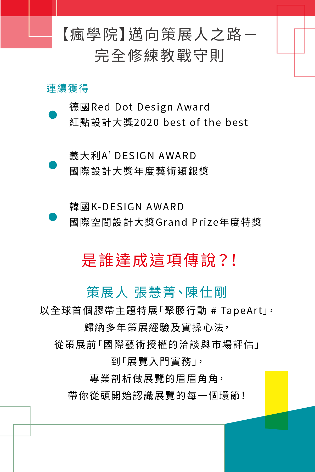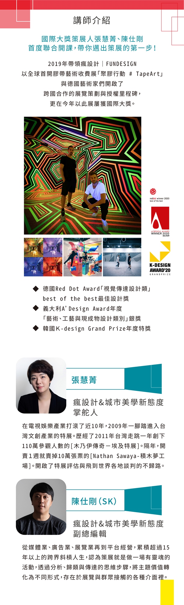 以全球首個膠帶主題特展「聚膠行動 #TapeArt」,拿下義大利A’ DESIGN AWARD 年度藝術類銀獎、德國紅點設計獎2020 Best of the Best以及韓國K-Design GRAND特獎的 策展人 張慧菁 & 陳仕剛