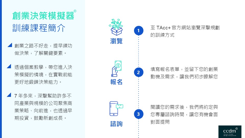 這是一個創業最好的時代,也是創業最壞的時代 不論是哪個時代,人們對創業的基本渴望並沒有改變,儘管有著不同的消費趨勢或平台,但是人們面對創業前的恐懼也從未改變過。 加速器如何在最短的時間內協助個人或新創團隊,槓桿自己本身的最大優勢與提升整體效益及生產力,將會決定我們所處的最好還是最壞的創業時代。