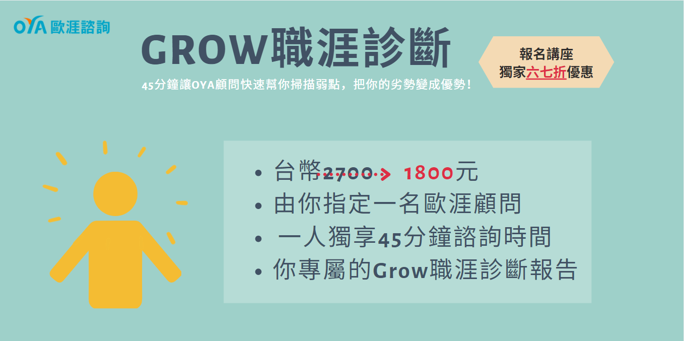 | 1人/$599 | 1人/$1800 | GROW職涯診斷六七折 | 2021/3/25 | $2,399 | |