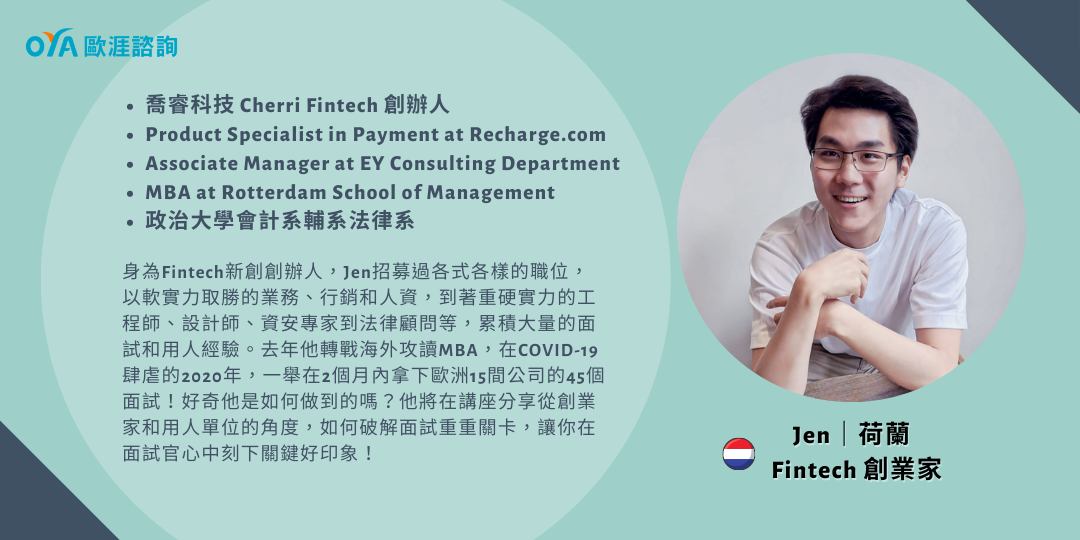 OYA本次講座邀請到OYA Career的創辦人Weiwei ,以及現在旅居荷蘭的前Fintech創業家Jen,告訴你什麼是一場完美的面試,為你講解面試前的沙盤推演和面試後的複盤技巧,全面解析面試架構與流程並分享實戰中各式各樣的突發狀況與燒腦問題的解方,並且在講座現場提供「英文實境模擬面試」及「面試題目的架構練習」,讓各位在未來收到的不再是拒絕信,而是接到手軟的錄取通知!