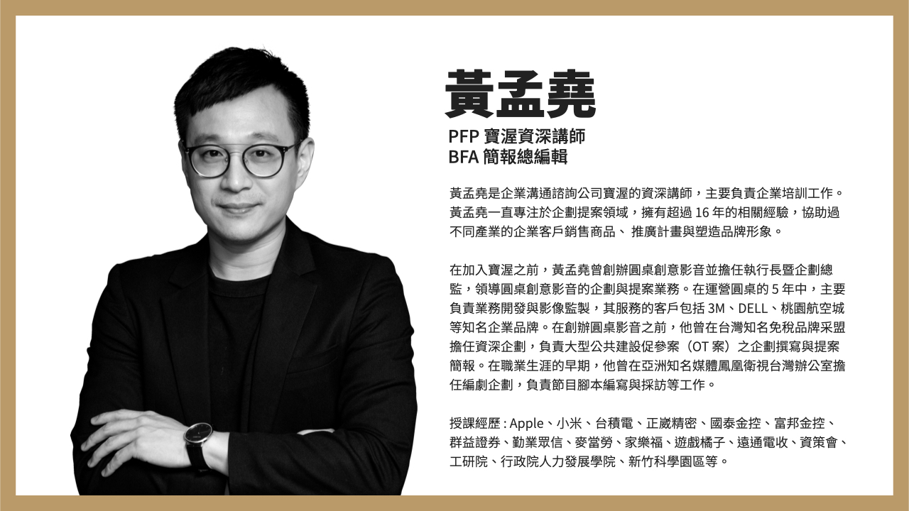 黃孟堯是企業溝通諮詢公司寶渥的資深講師,主要負責企業培訓工作。黃孟堯一直專注於企劃提案領域,擁有超過 16 年的相關經驗,協助過不同產業的企業客⼾銷售商品、 推廣計畫與塑造品牌形象。